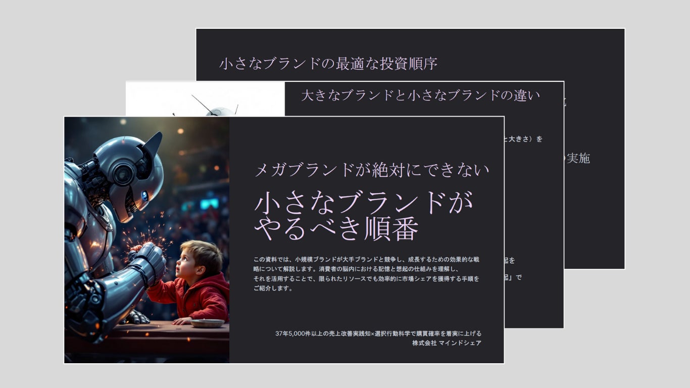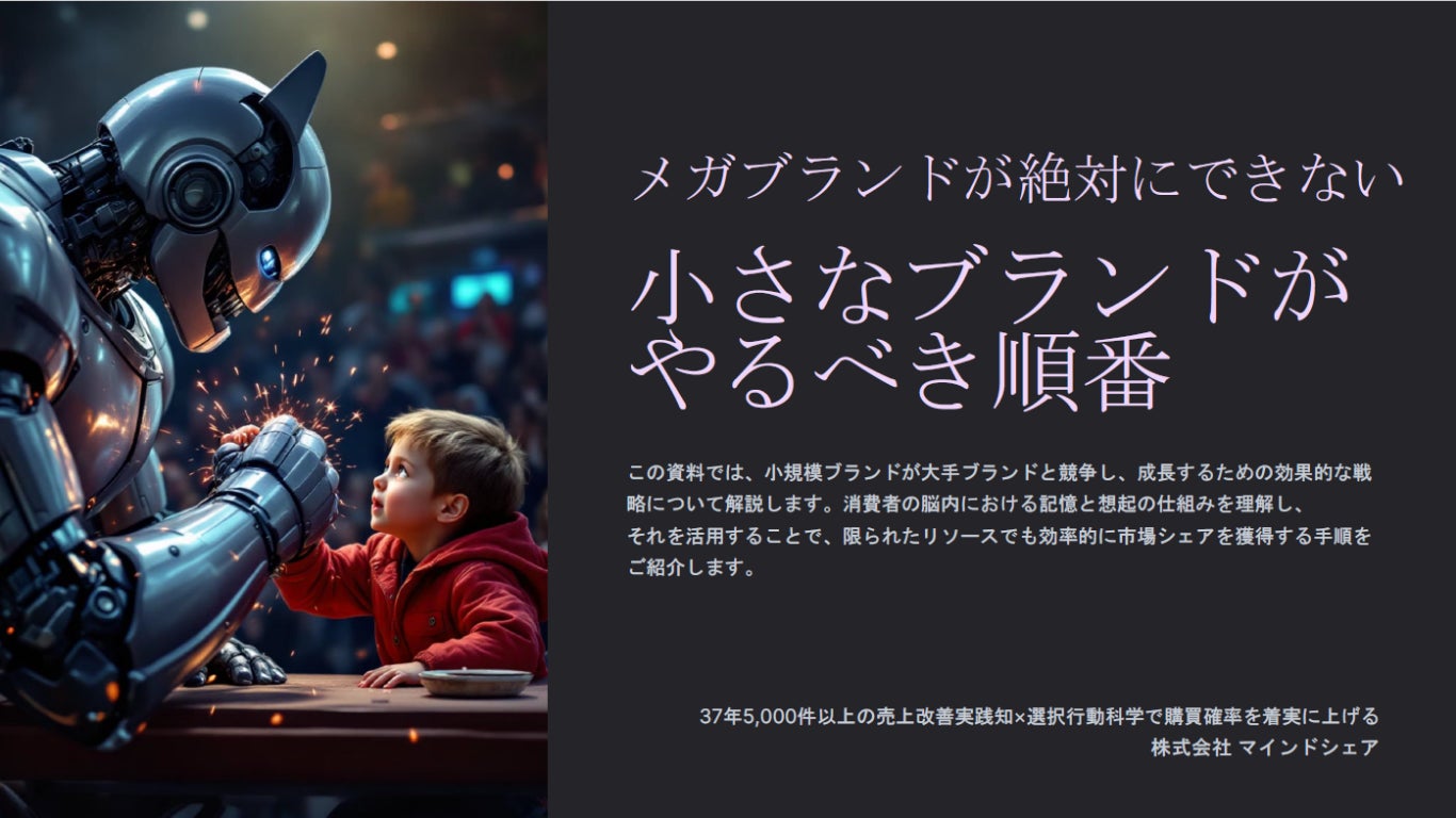食品・菓子・飲料・酒類メーカー、ヘルスケアメーカーの経営・ブランド・マーケティング・開発・営業・広告・販促チームなど37年5,000件以上の支援実績を有する株式会社マインドシェア(東京都港区)は、同社が開催するマーケティング講習やセミナーで大好評の独自ノウハウを抜粋した資料の第3弾『メガブランドが絶対にできない 小さなブランドがやるべき順番』を無料公開いたしました。