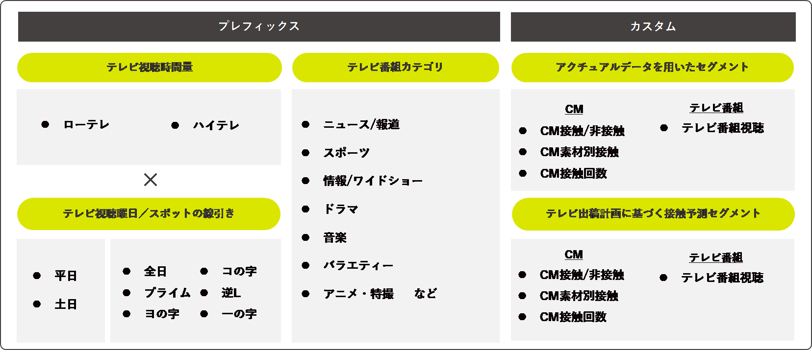 いつどんなテレビ番組を見ているか、といった視聴傾向によるターゲティング配信はもちろんのこと、過去の視聴傾向とテレビスポット出稿計画からTVCM接触有無を予測し、TVCM接触が見込まれない生活者に対してコネクテッドテレビ上でターゲティング配信することができ、地上波とコネクテッドテレビ上のVODサービス視聴を横断した対応が可能となります。(図2)また、プライバシー保護の観点でcookieや広告IDの使用に制限が設けられてきている中、個人に紐づかないネットワーク識別情報を活用することで、プライバシーにも考慮しながらシームレスに生活者のテレビ視聴状況を加味したターゲティングを行います。