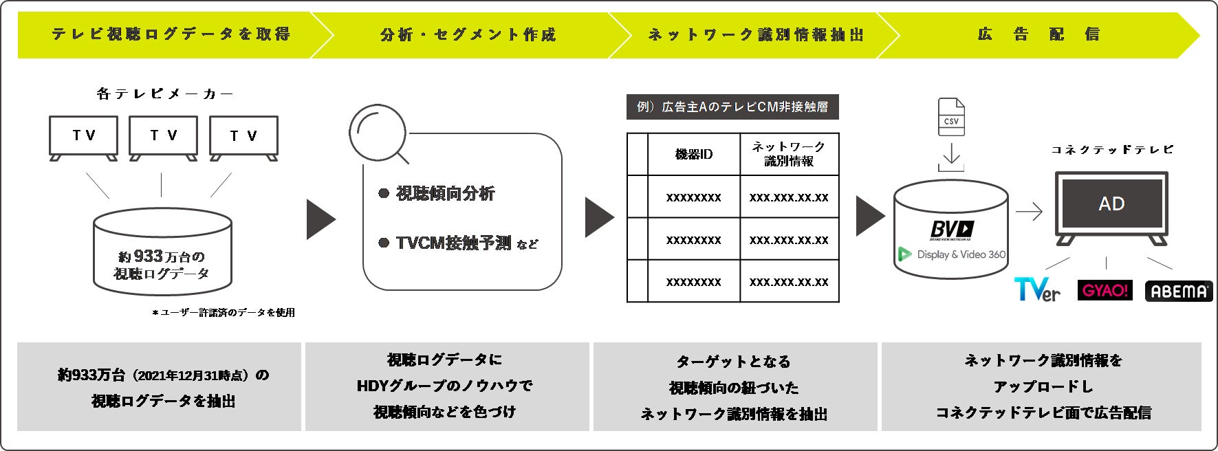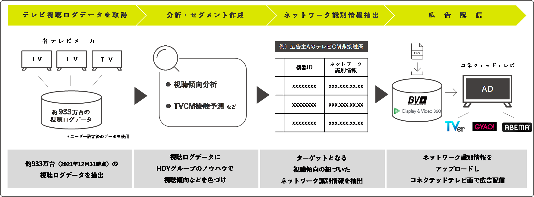 このような変化を受け、博報堂DYメディアパートナーズは、デジタル・アドバタイジング・コンソーシアム株式会社(以下、DAC)と共同で、約933万台(2021年12月31日時点)のテレビ視聴データ(ユーザー許諾を得たデータを使用)に紐づくネットワーク識別情報を活用して「Brand View Instream Ad™」(※2)、Googleが提供するDSP「ディスプレイ&ビデオ 360」(※3)でプライバシーを考慮しながら、TVer/ABEMA/GYAO等に広告配信することができるソリューションを開発し、提供を開始します。(図1)