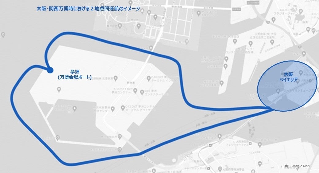 ①大阪・関西万博時の2地点間運航実現に向け、大阪ベイエリアの離着陸ポート候補地について、必要となるインフラや飛行航路の検証を行う。