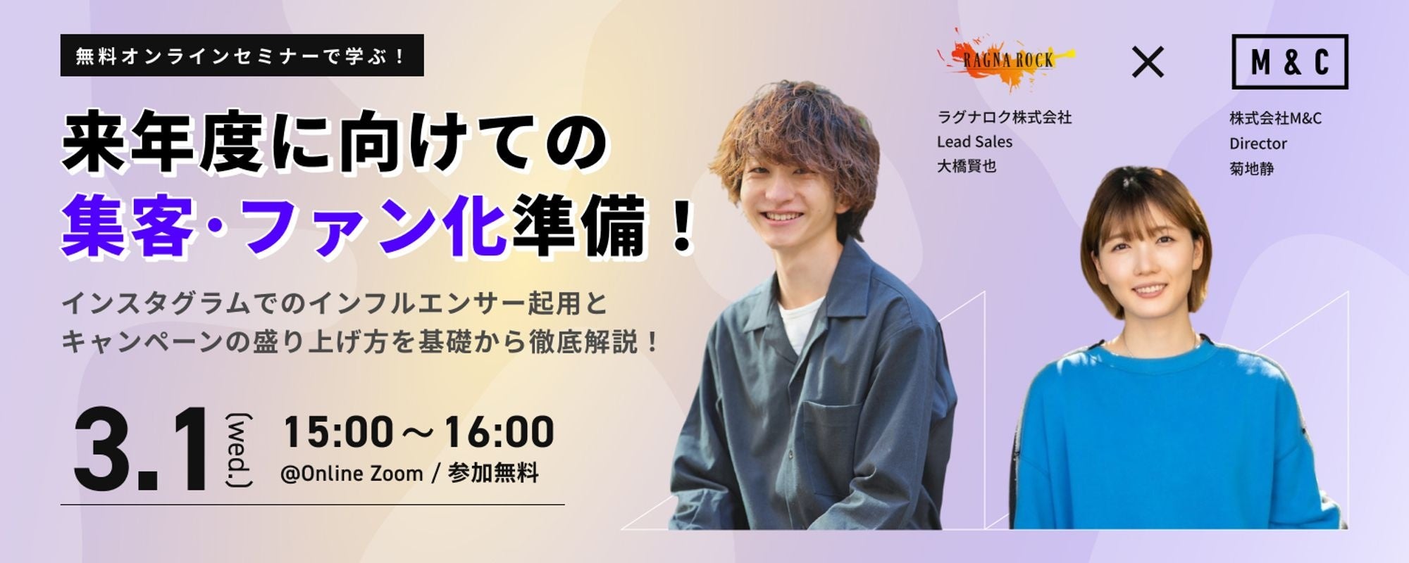 ラグナロク株式会社(本社:東京都渋谷区、代表取締役:西本 誠)は、株式会社M&Cと共同でオンラインセミナーを開催することをお知らせします。3月1日(水)15:00より、弊社担当がZoomでのオンラインセミナーに登壇いたします。