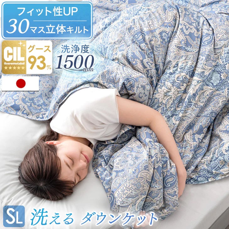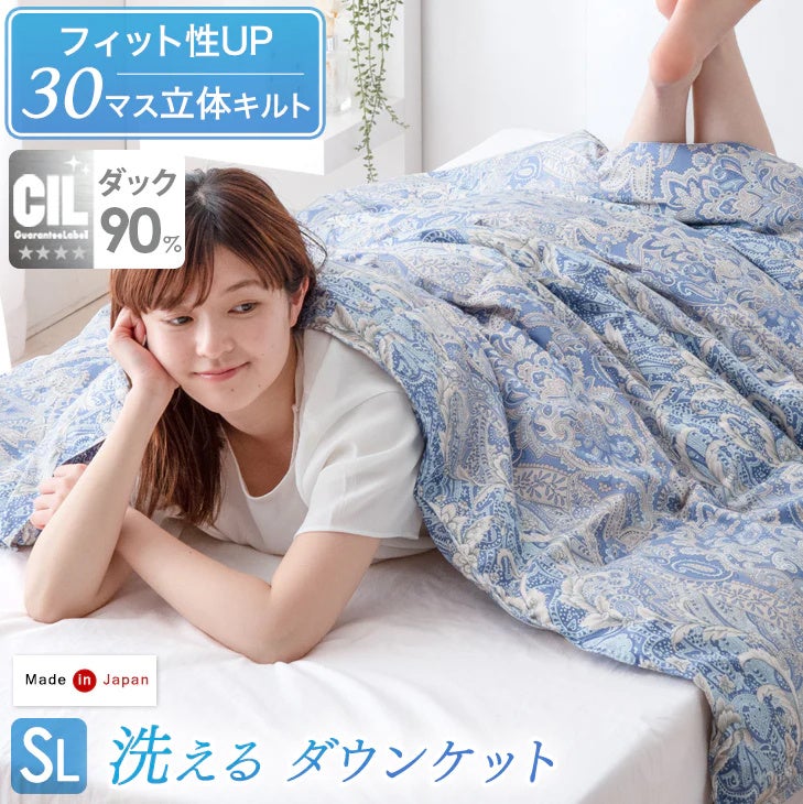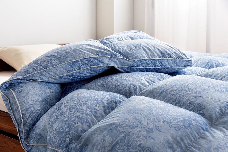 寒暖差が激しい今の季節に特におすすめのダウンケット。吸湿、放湿性に優れたダウンが寝具内を蒸れにくく、ほどよく保温します。