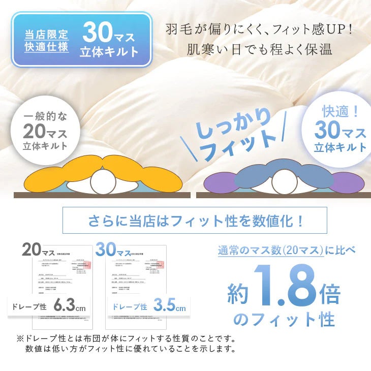 またドレープ性(フィットしやすさ)もアップする効果があり、20マスの立体キルト構造のドレープ性が6.3cmに対して、30マスの立体キルト構造のドレープ性は、3.5cmと通常のマス数である20マスのものと比較して、約1.8倍フィット性が向上します。