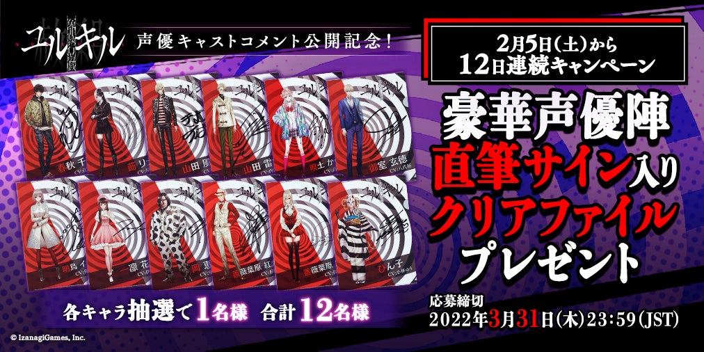 ユルキル公式Twitterにて、本日2月5日より12日間連続で毎日1キャラクターずつ18時にキャストコメントが公開され、19時に声優直筆サイン入りクリアファイルプレゼントキャンペーンが実施されます。