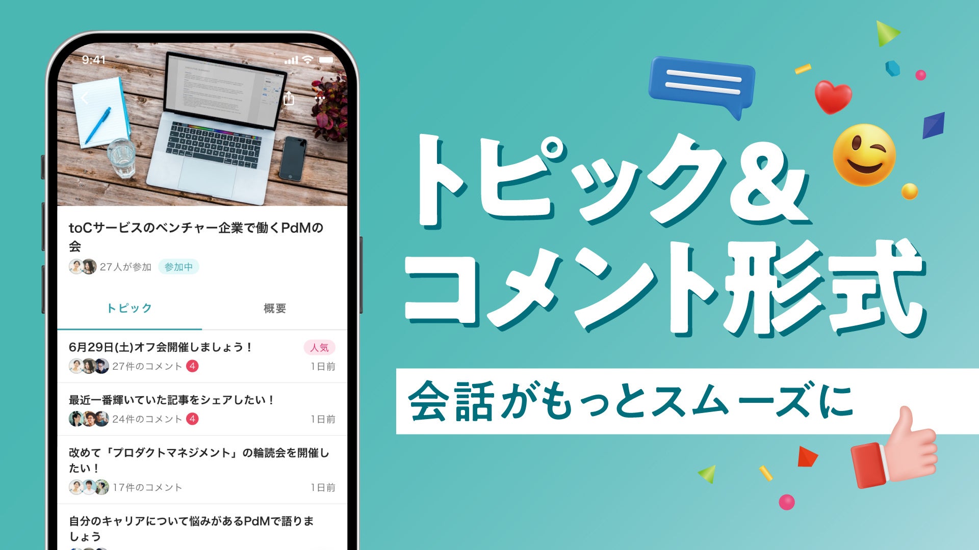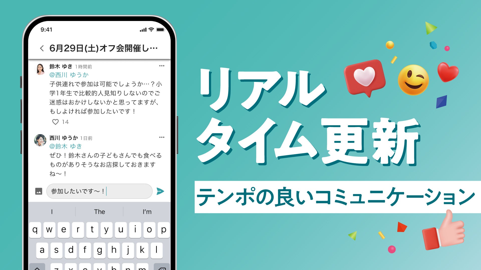 トピック内のコメントはリアルタイムで更新されます。今までのタイムライン形式では生まれなかった、より活発でスムーズなコミュニケーションをお楽しみください。