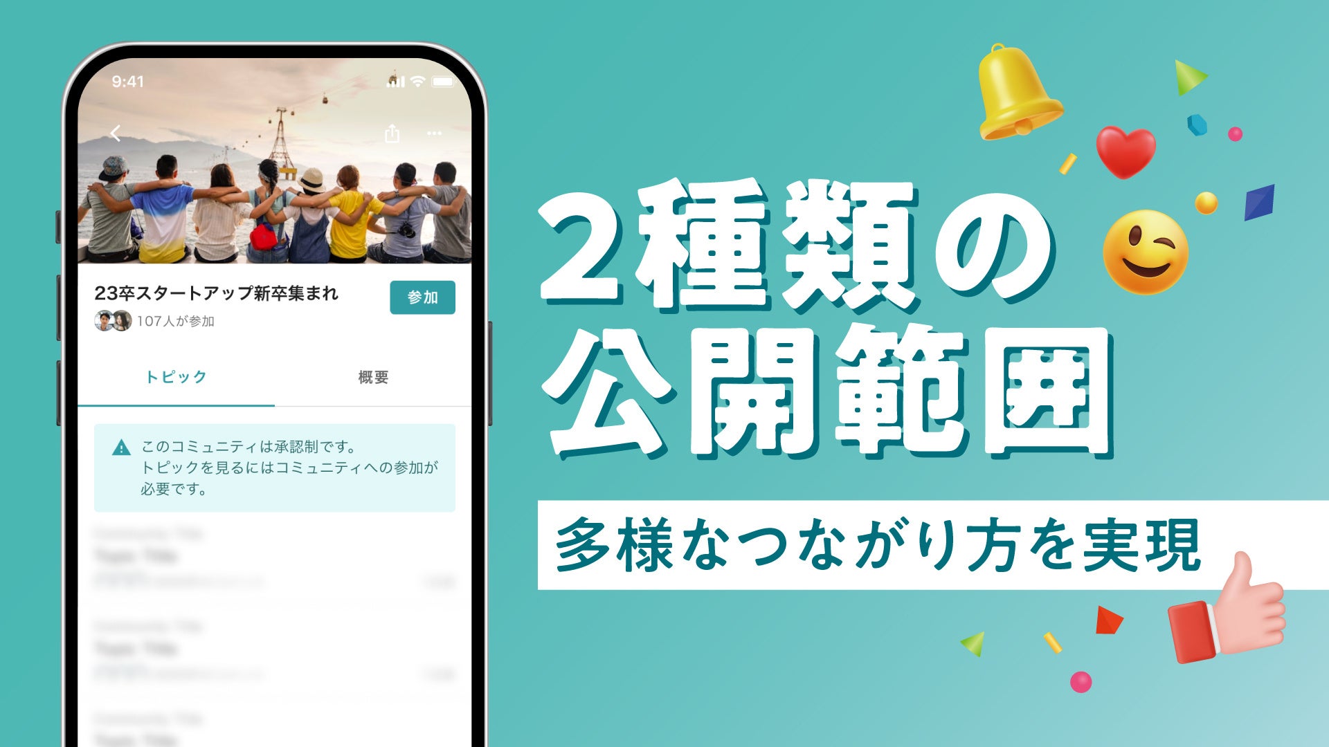 コミュニティを作成する際に「全体公開」と「承認制」の2種類から選択することが可能です。「全体公開」はどなたでも自由に参加できるコミュニティとなります。一方「承認制」に参加するにはコミュニティオーナーの承認が必要になります。コミュニティの目的に応じて、使い分けることができます。