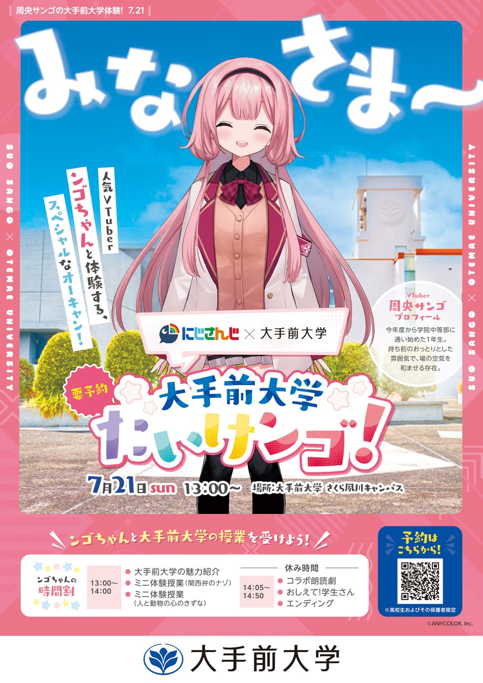 オープンキャンパスには、にじさんじ所属の人気VTuber周央サンゴさんが来学し、「周央サンゴの大手前大学体験!7.21」と題して、本学のクロスオーバーの学びを体感していただきます。