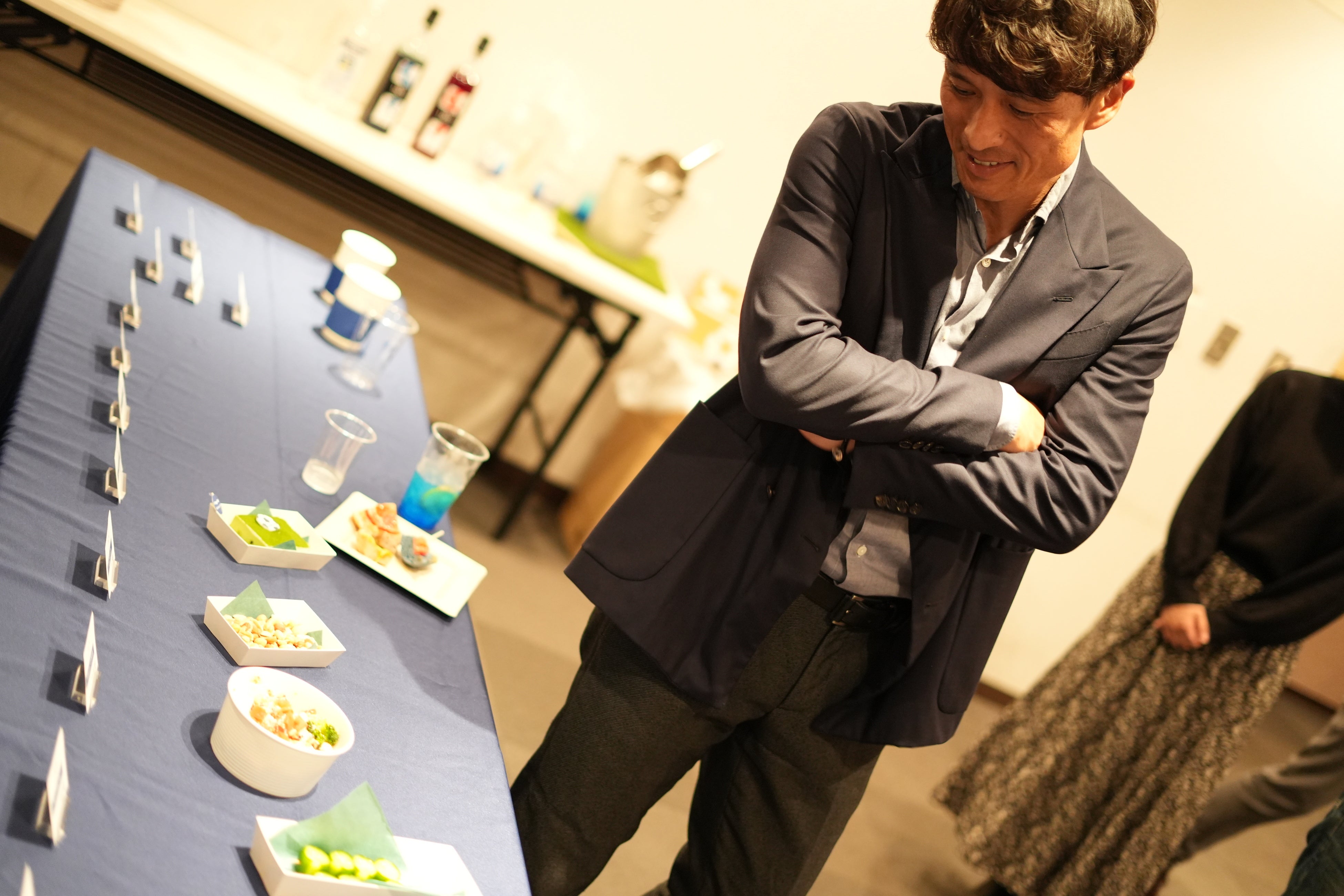 blue-ing!のカフェ&バーでは、オリジナルのフード・ドリンクメニューを提供します。試食会で宮本専務理事は、ハンバーガーのバンズの食感やピザのサイズなどについて、料理長らと熱心に議論。サッカーのフォーメーションにちなんだ「4バックきゅうり」のネーミングなどにも関心を示していました。
