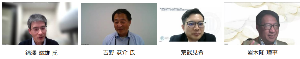 パネルディスカッションでは、モデレーターを当協会理事の岩本隆(慶應義塾大学大学院政策・メディア研究科特任教授)が務め、『農山漁村地域の振興と再エネ導入について』をテーマに意見交換が行われました。聴講者の皆様より「再エネ種別による関係者の受容性に違いはあるのか?」等、実際に事業を推進する立場から具体的な質問が出されるとともに、登壇者の皆様からは協議会設置のメリットや行政への提言を実現するためのポイントについて紹介があり、活発なディスカッションが交わされました。