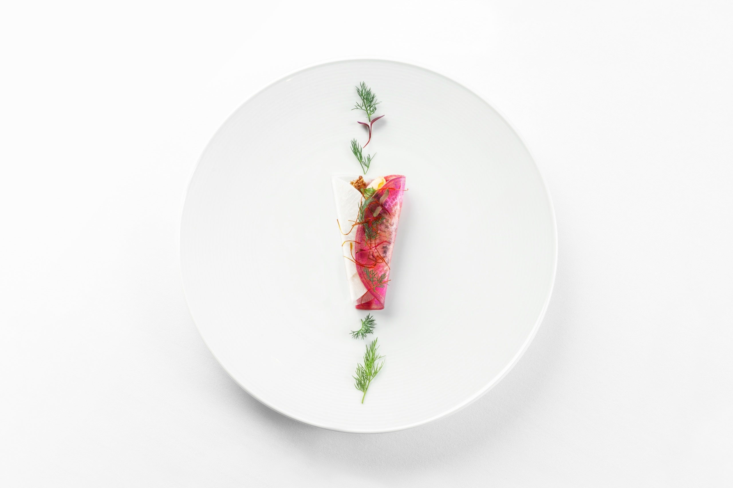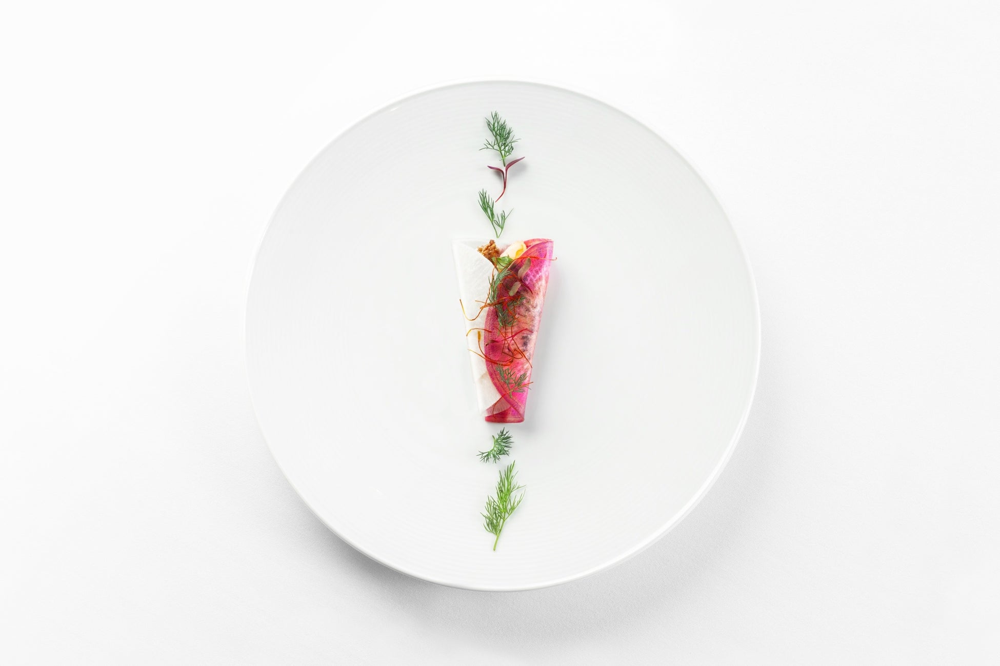 “コナ”ロブスターのポーチド、スピルリナ、サフラン・アイオリのドット