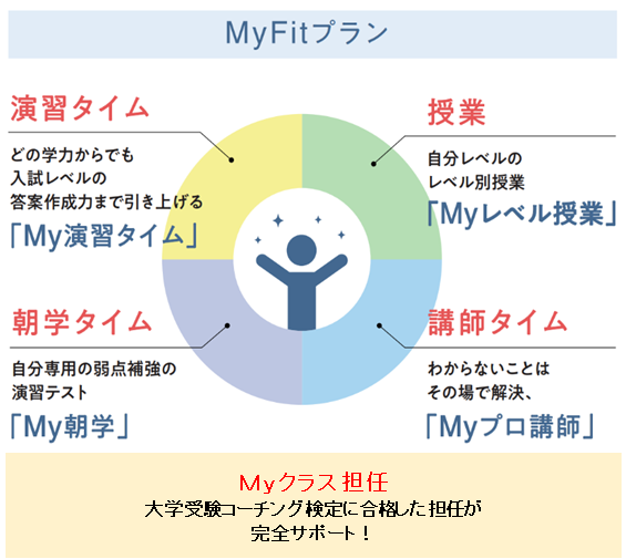 MyFitプランでは、ICT教材やICT演習を活用し効率的に答案作成力を引き上げる演習タイム、レベル別の授業、講師タイムのよる講師コーチングや質問対応、そして、朝学タイムでの朝学習を導入し朝からの学習習慣を確立し、学習時間を確保します。