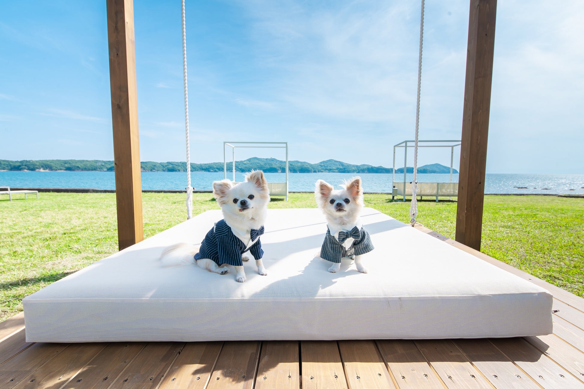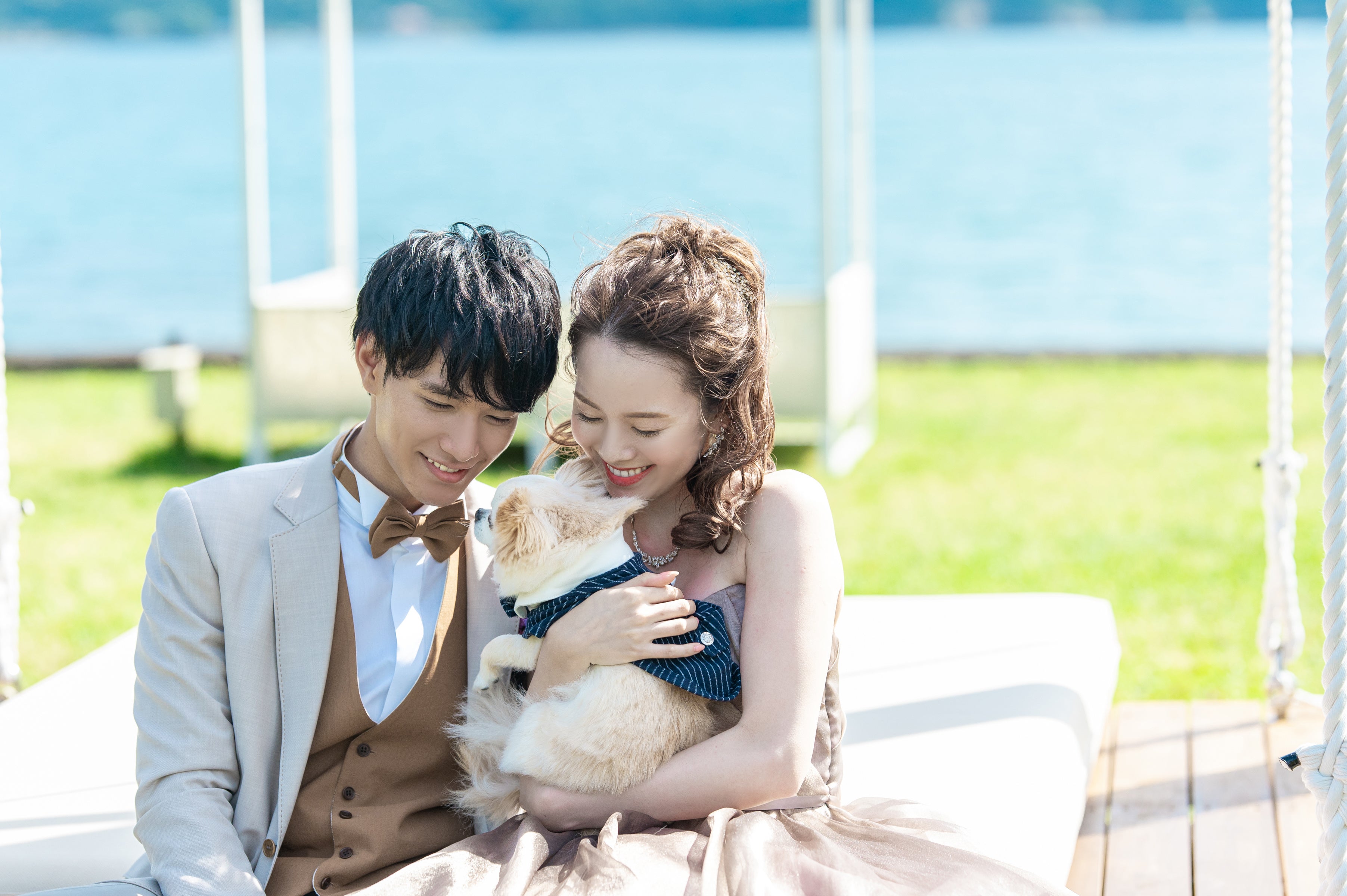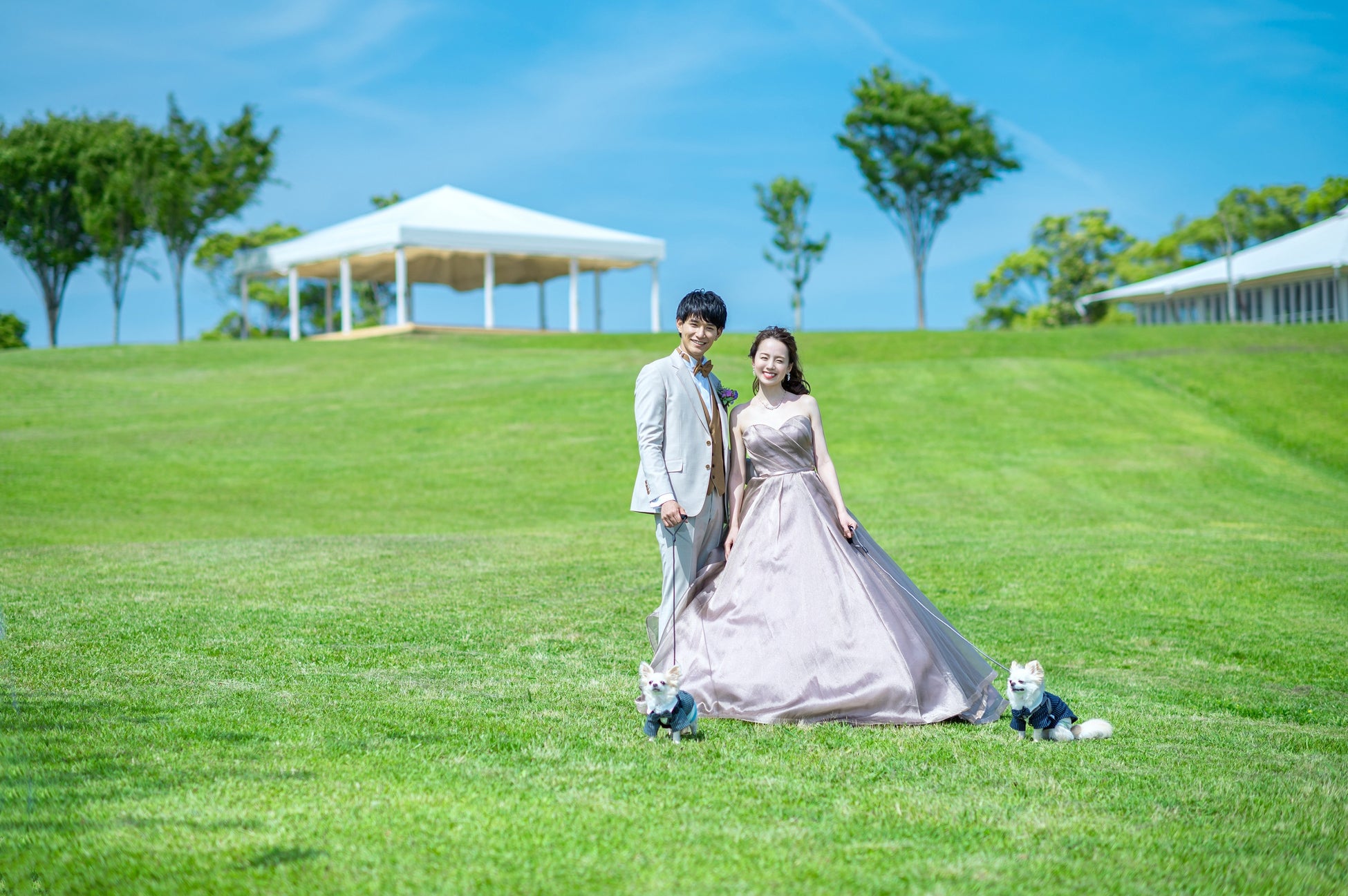 大切な日だからこそ、ワンちゃんにお揃いの蝶ネクタイやベールなど着せて、一緒に撮影ができるのは、NEMU RESORTならでは。広大な敷地内を、リードをつけて一緒に歩いたり、ランドカーで散策も楽しめます。