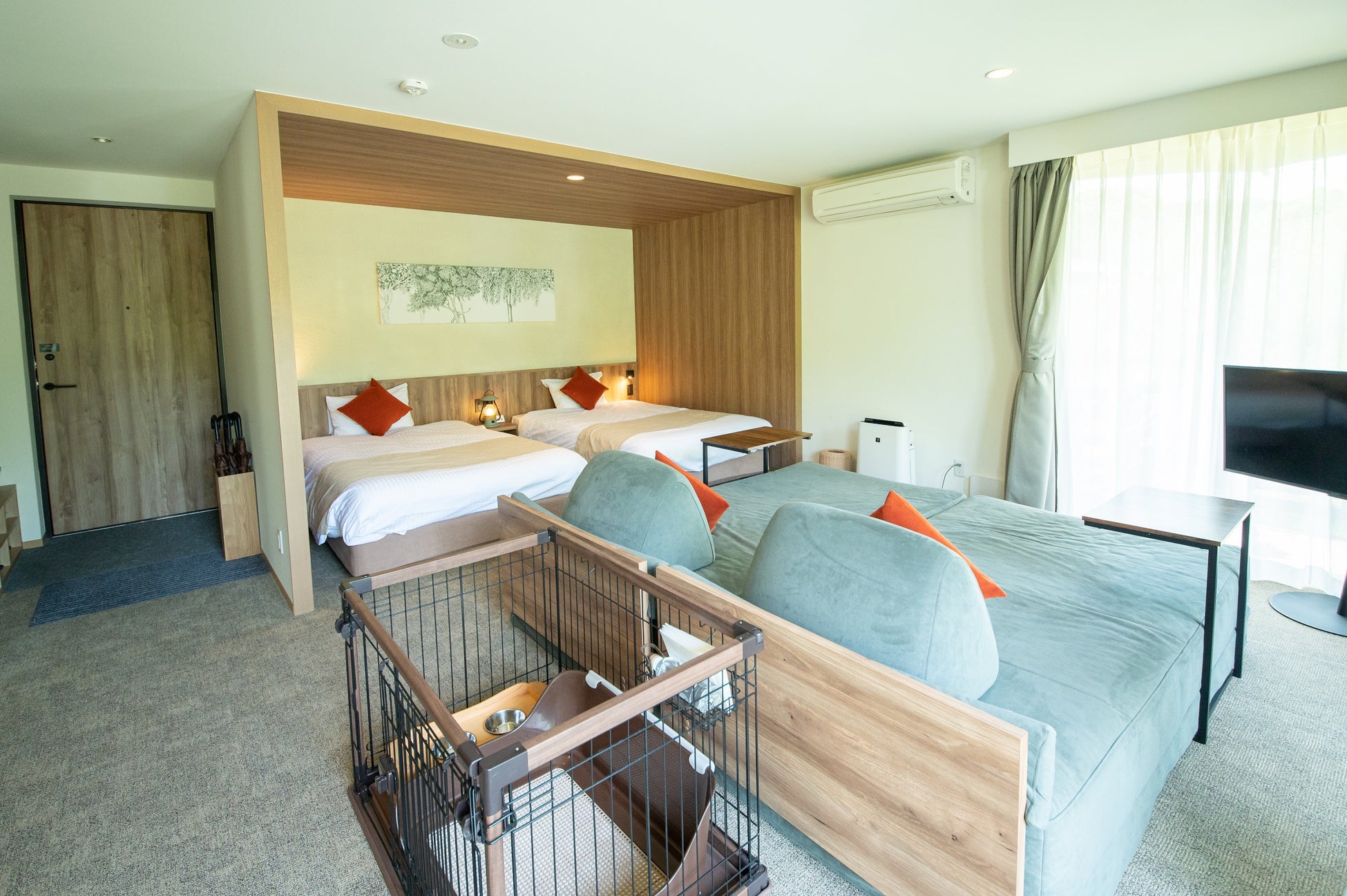 2022年春にオープンしたヴィラ棟では、8棟のうち4棟はワンちゃんとのご宿泊も可能です。各ヴィラには、ワンちゃんのケージをはじめ、専用備品やアメニティ、おやつなどのサービスを準備しておりますので、手ぶらでもワンちゃんと一緒に快適にご滞在いただけます。