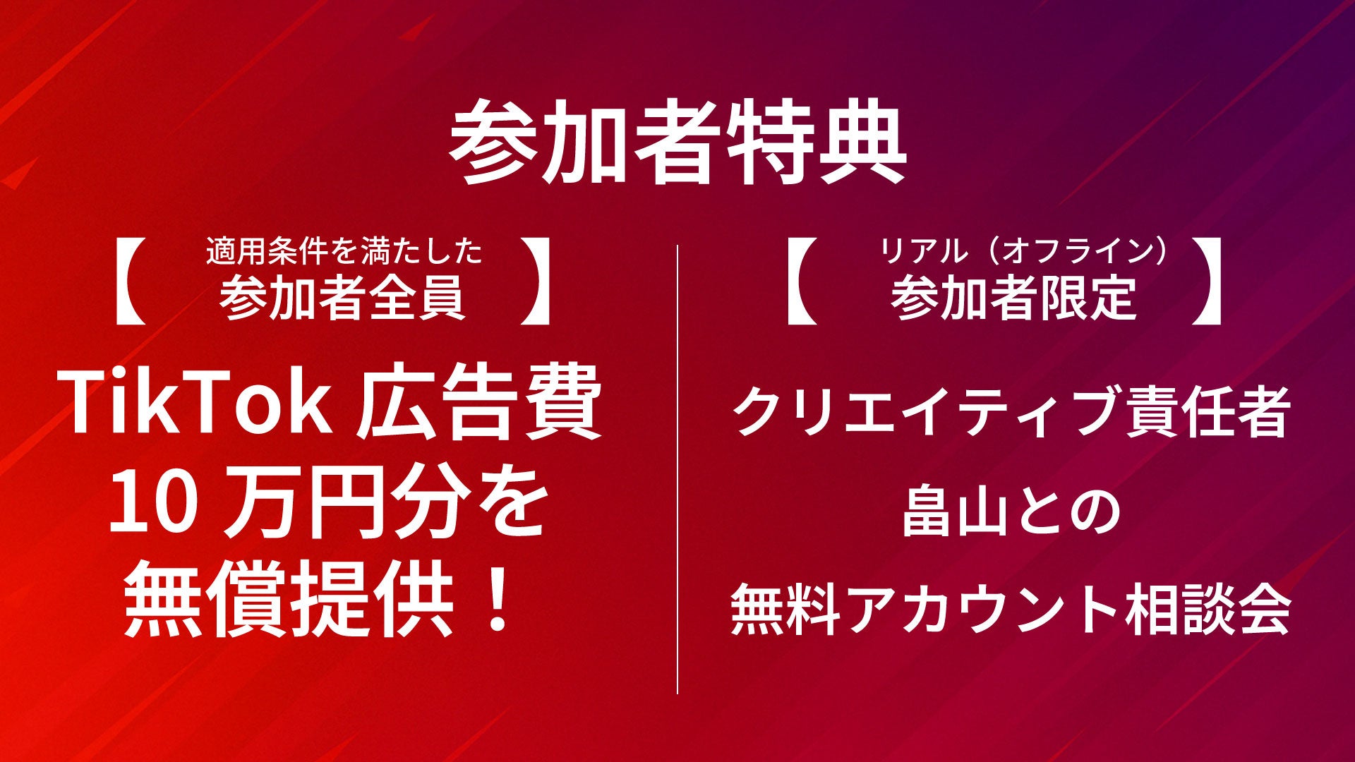 さらに、適用条件を満たした参加者全員にTikTok広告費10万円分を無償提供する特典付き(条件あり)。リアル(オフライン)参加者には、クリエイティブ事業部責任者の畠山との無料個別相談会も実施します。