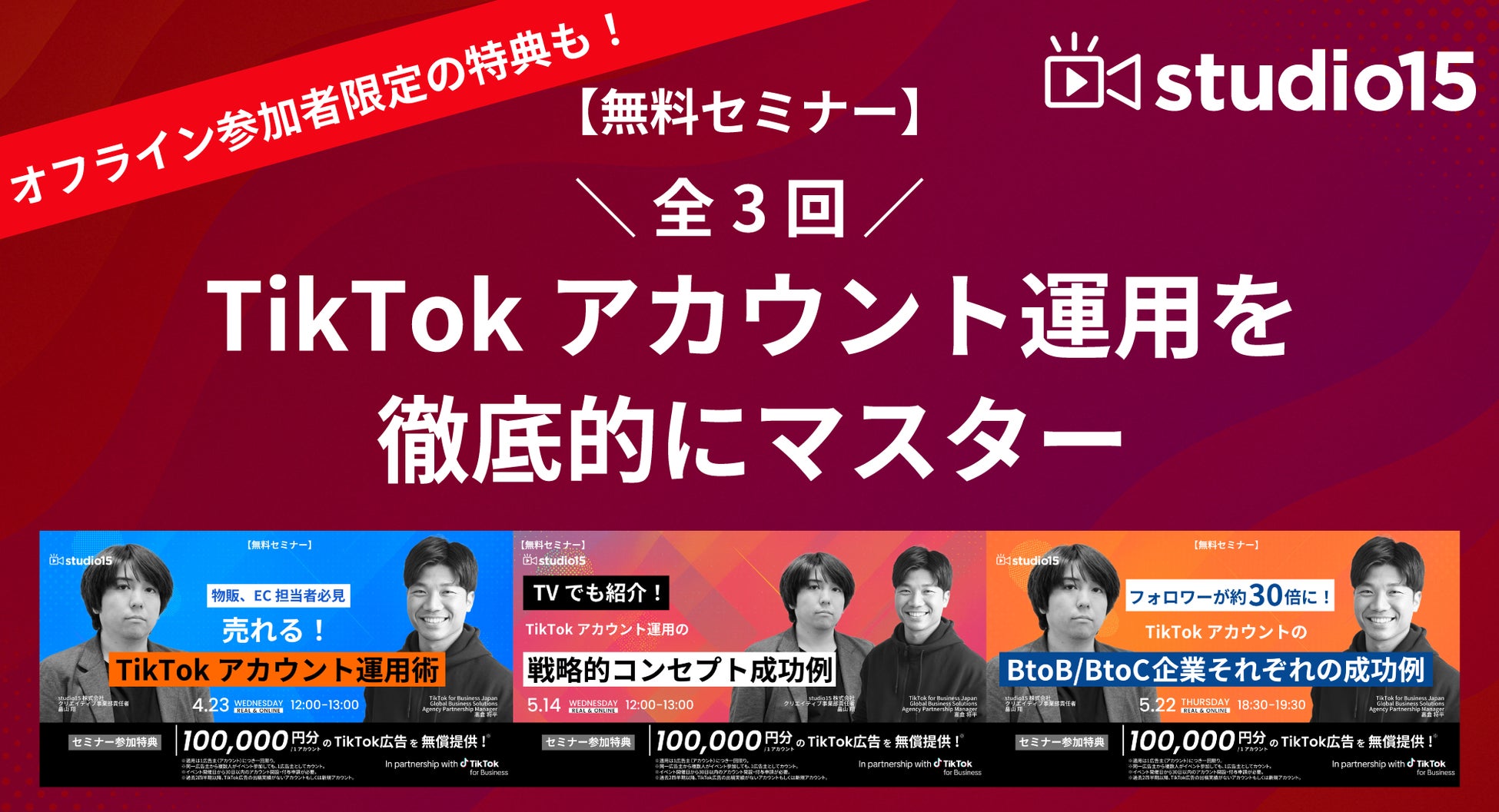全3回すべてに実践ノウハウと成功事例が詰まった内容。参加者特典として適用条件を満たした方に10万円分のTikTok広告+オフライン限定でアカウント運用相談会も無償提供!