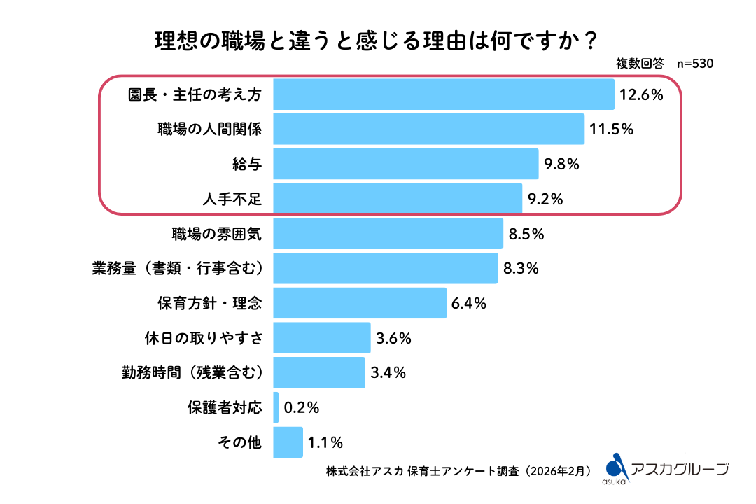 「職場の人間関係」が57.4%(304人)で最多となり、やりがいの中心が“子どもとの関わり“であるのとは対照的に、職場環境や組織体制への課題が浮き彫りとなりました。「給与が見合わない/33.8%(179人)」「人手不足/30.4%(161人)」を上回る結果です。