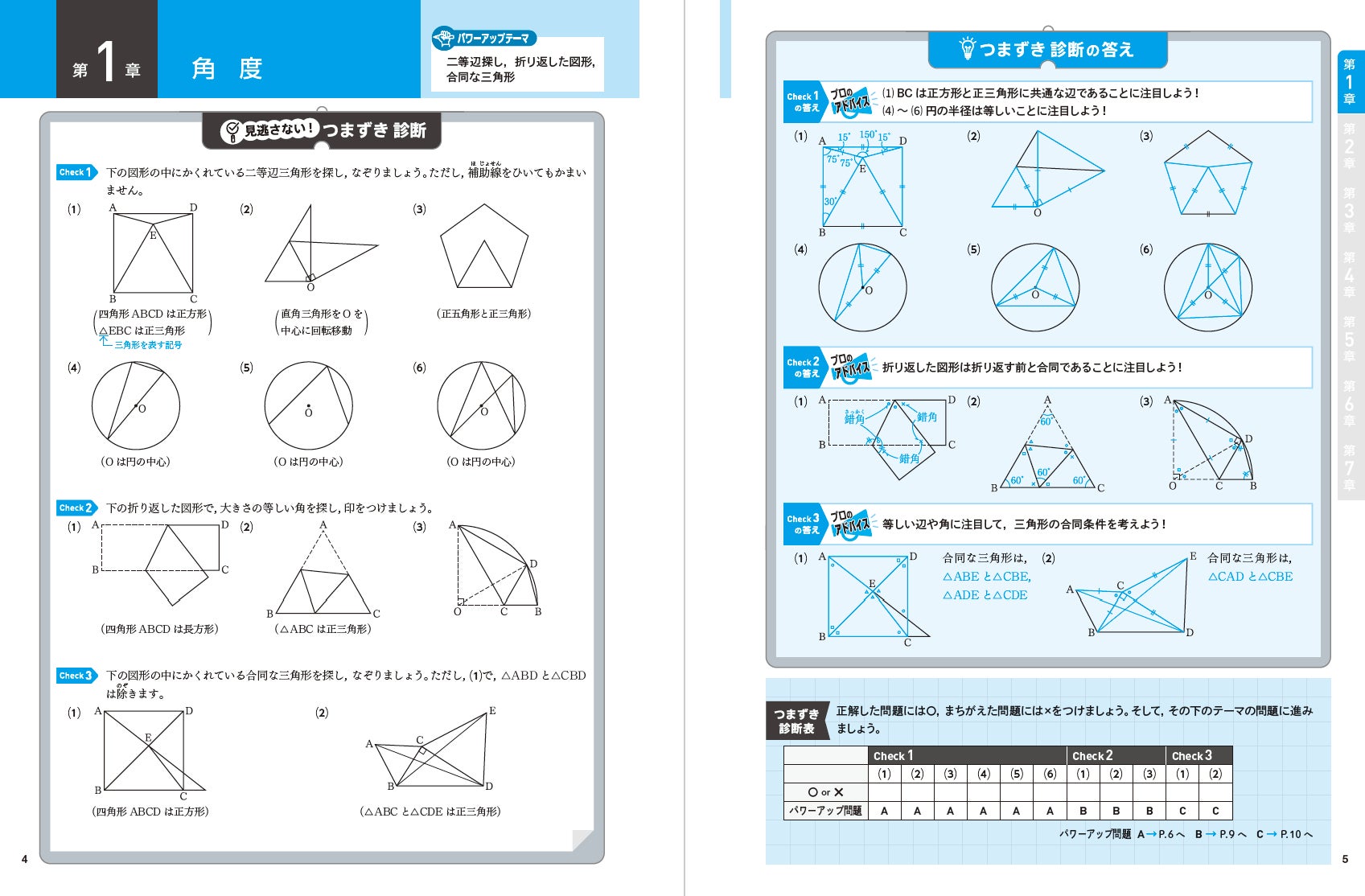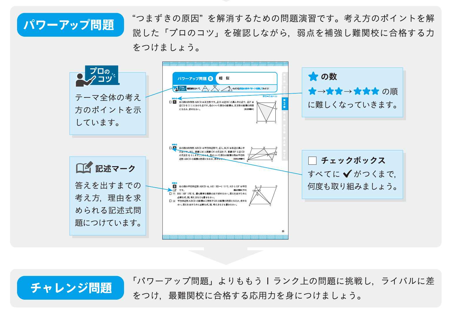 中学入試で頻出の分野を図形問題は7章、文章題は8章に分け、「つまずき診断」→「パワーアップ問題」→「チャレンジ問題」の順に3段階で実戦力を養います。「つまずき診断」では、自分が苦手としている問題を見つけ、それを「パワーアップ問題」で克服し、さらに「チャレンジ問題」で実力を完成させます。「パワーアップ問題」と「チャレンジ問題」では、難関校の入試問題を採用していて、そこで問われる知識やテクニックを身につけることができます。