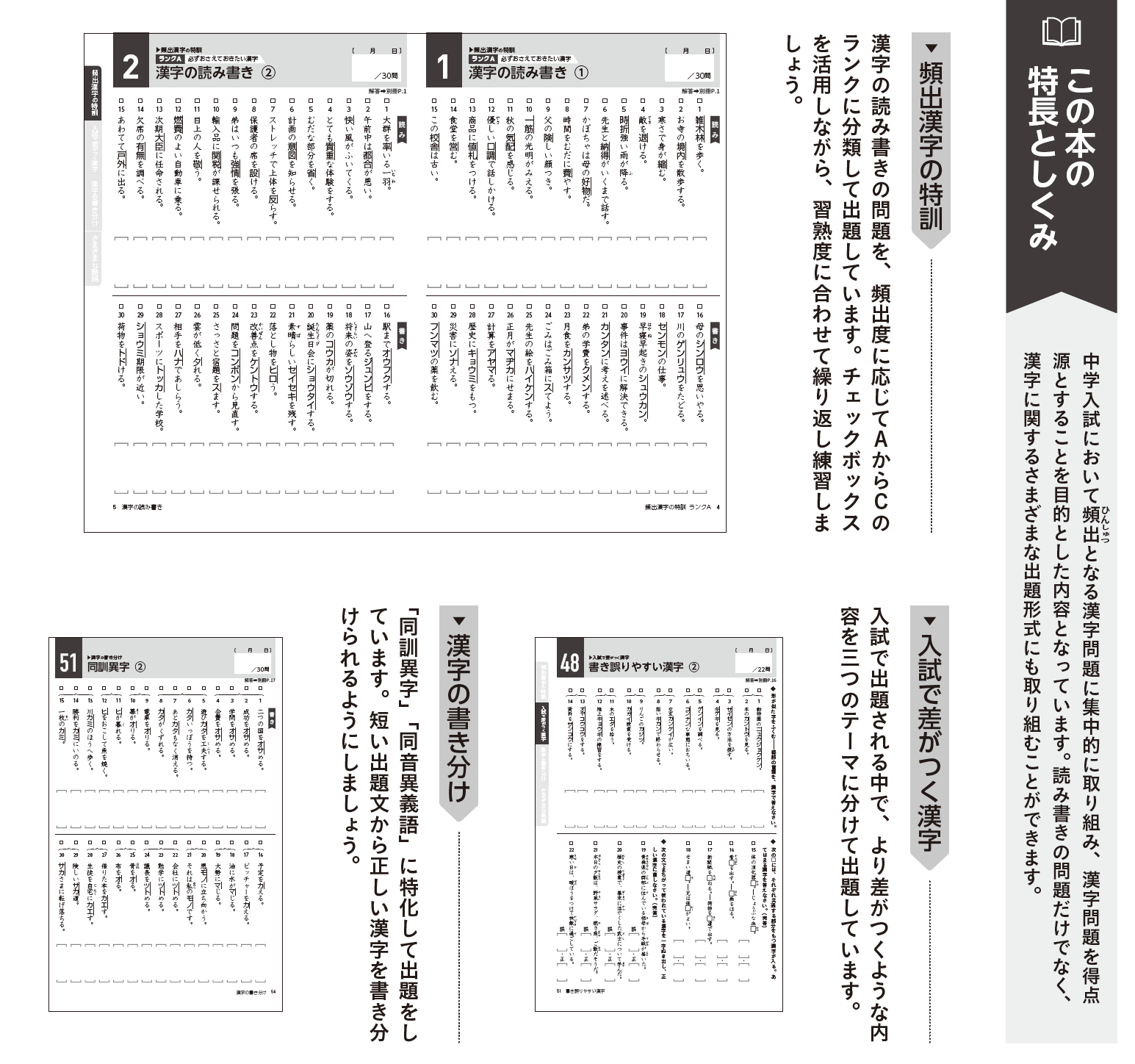 中学入試でよく問われる読み書きを、頻出度を踏まえて出題しています。チェックボックスを活用しながら、習熟度に応じて繰り返し取り組むことで、頻出漢字を身につけていくことができます