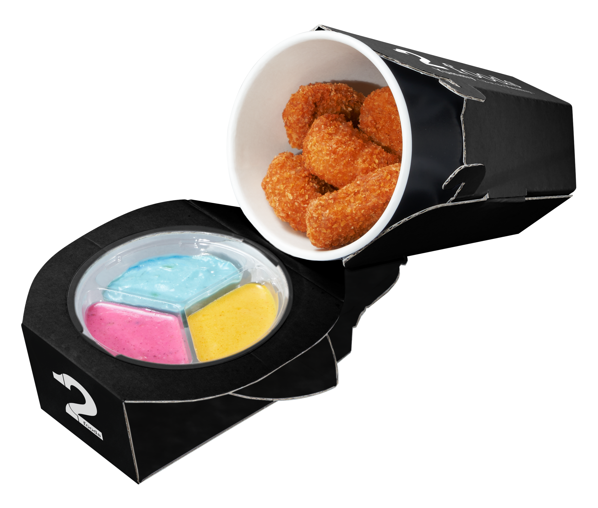 2foodsの店舗で提供するメニューは、2foodsのロゴのカラーをイメージし、ジャンク感を演出した3種類の「2foodsジャンクソース」をセットで提供いたします。※冷凍タイプは付属なし