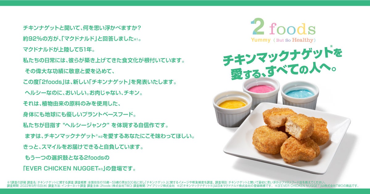 2foodsが行った独自のアンケートにおいて、「チキンナゲット」と聞いて思い浮かべるファストフード店として、約92%の方が「マクドナルド」と回答しました※3。マクドナルドが日本に上陸して51年、彼らが築き上げてきた食文化は日常に浸透しており、私たち2foodsはその偉大な功績に敬意を持っています。また、2foodsはエシカルな社会の実現のため、プラントベースフードカルチャーを広めるべく活動しており、地球にも体にも優しいプラントベースのナゲットが、動物性食品であるナゲットと並び、食の選択肢の一つとして当たり前の存在になっていくことを目指しています。