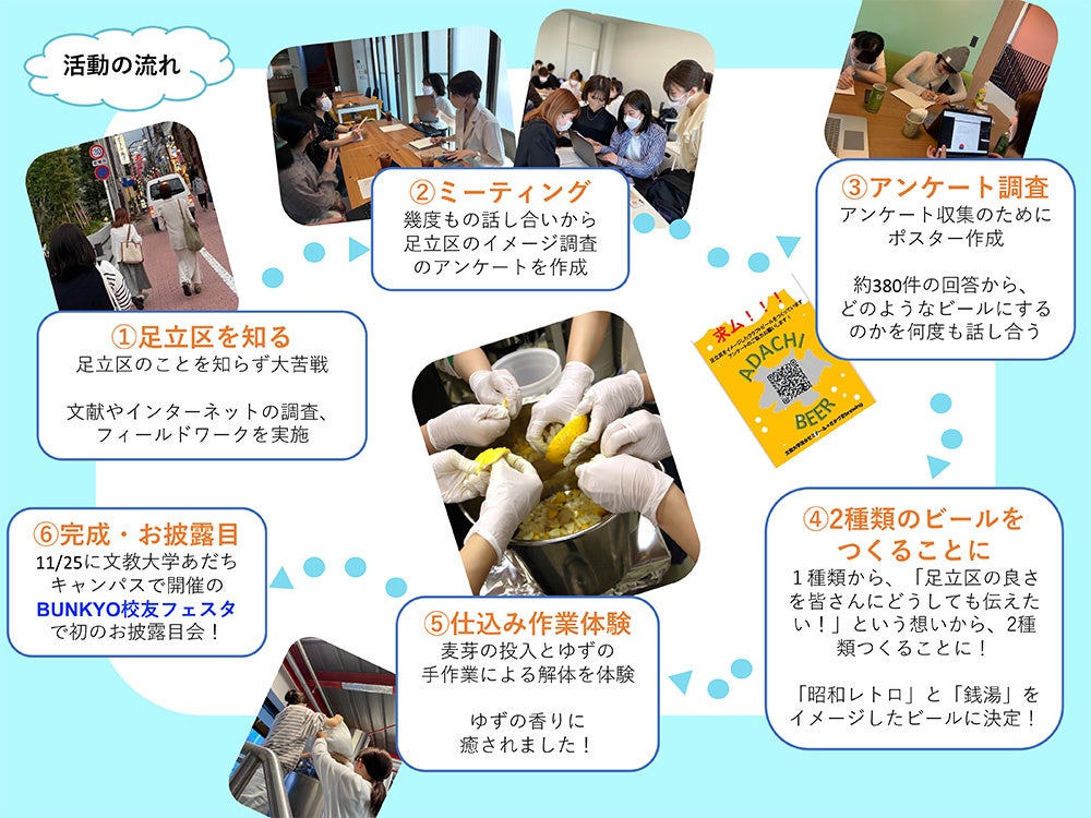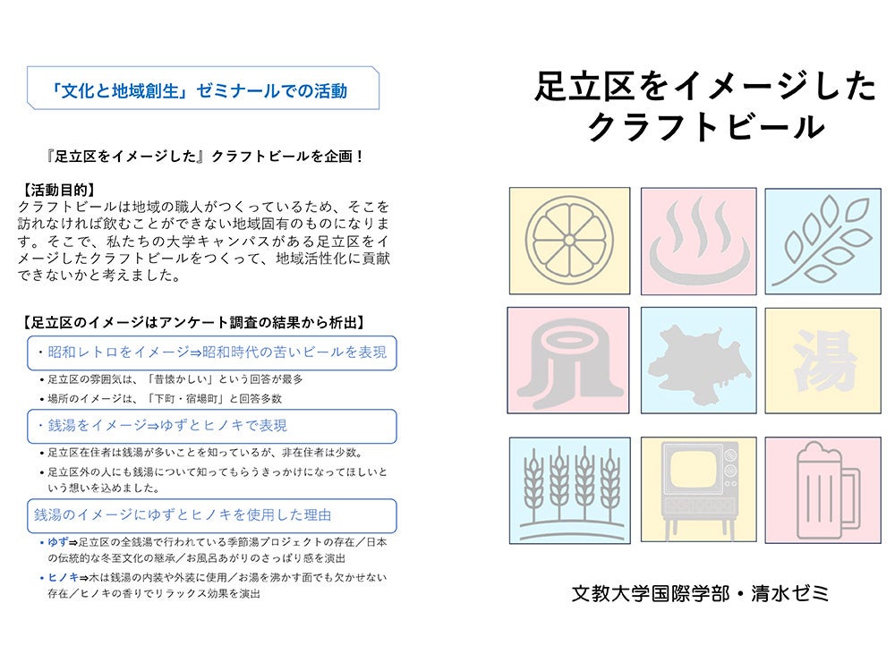 【本件のポイント】 ・文教大学国際学部の清水麻帆ゼミナールの学生が“足立区をイメージしたクラフトビール”作りに挑戦 ・アンケート調査の結果から足立区のイメージを設定し「ノスタルジックラガー」と「ゆうばれエール」が誕生 ・文教大学、足立区に関連した各イベントでゼミナール生が活動をPR |