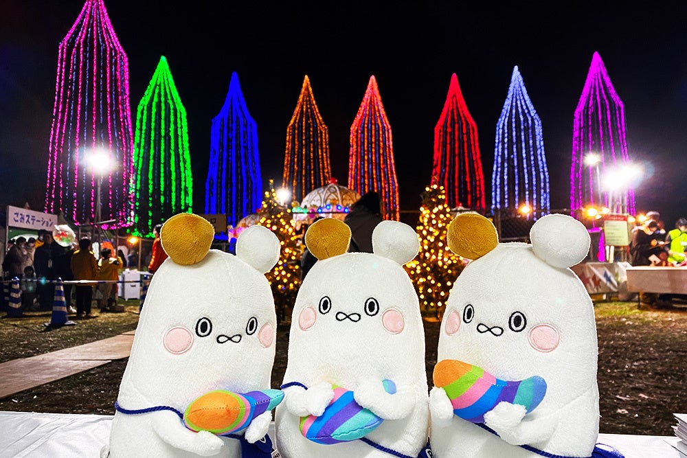△元渕江公園のイルミネーションと文教大学公式マスコットキャラクター「BUNKO」