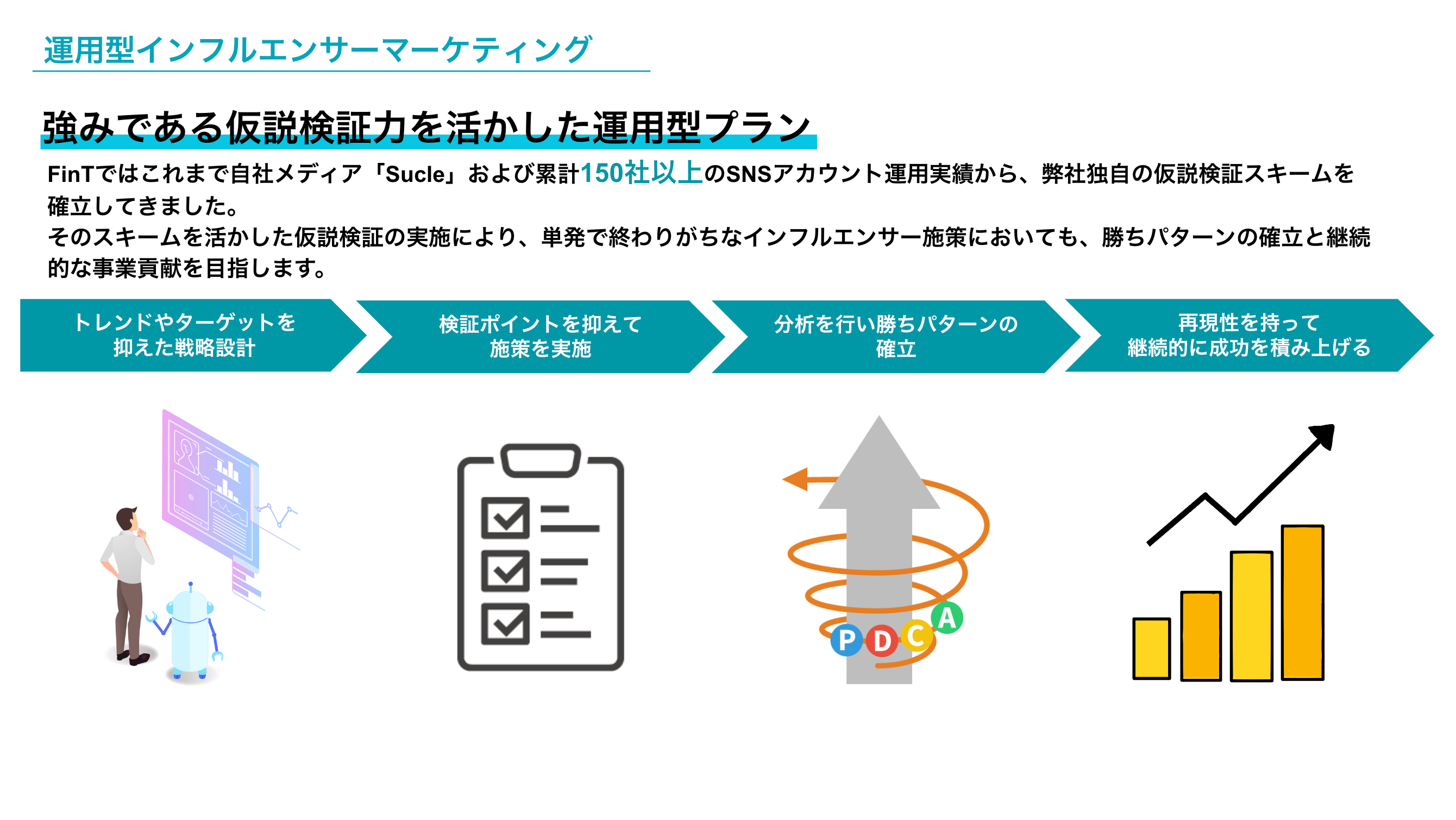 そこで今回FinTでは単発ではなく、施策を積み重ねるほどより成功確度が高まる「運用型インフルエンサーマーケティング」のプラン提供を開始しました。これまで、FinTは、自社メディア「Sucle」、および、累計200社以上のSNSアカウント運用実績から、弊社独自の仮説検証スキームを確立してきました。この仮説検証スキームを、インフルエンサーマーケティング施策にも応用することによって、施策ごとに知見が溜まり続け、企業様それぞれの独自のインフルエンサーマーケティングにおける勝ちパターンを導き出すことが可能になります。