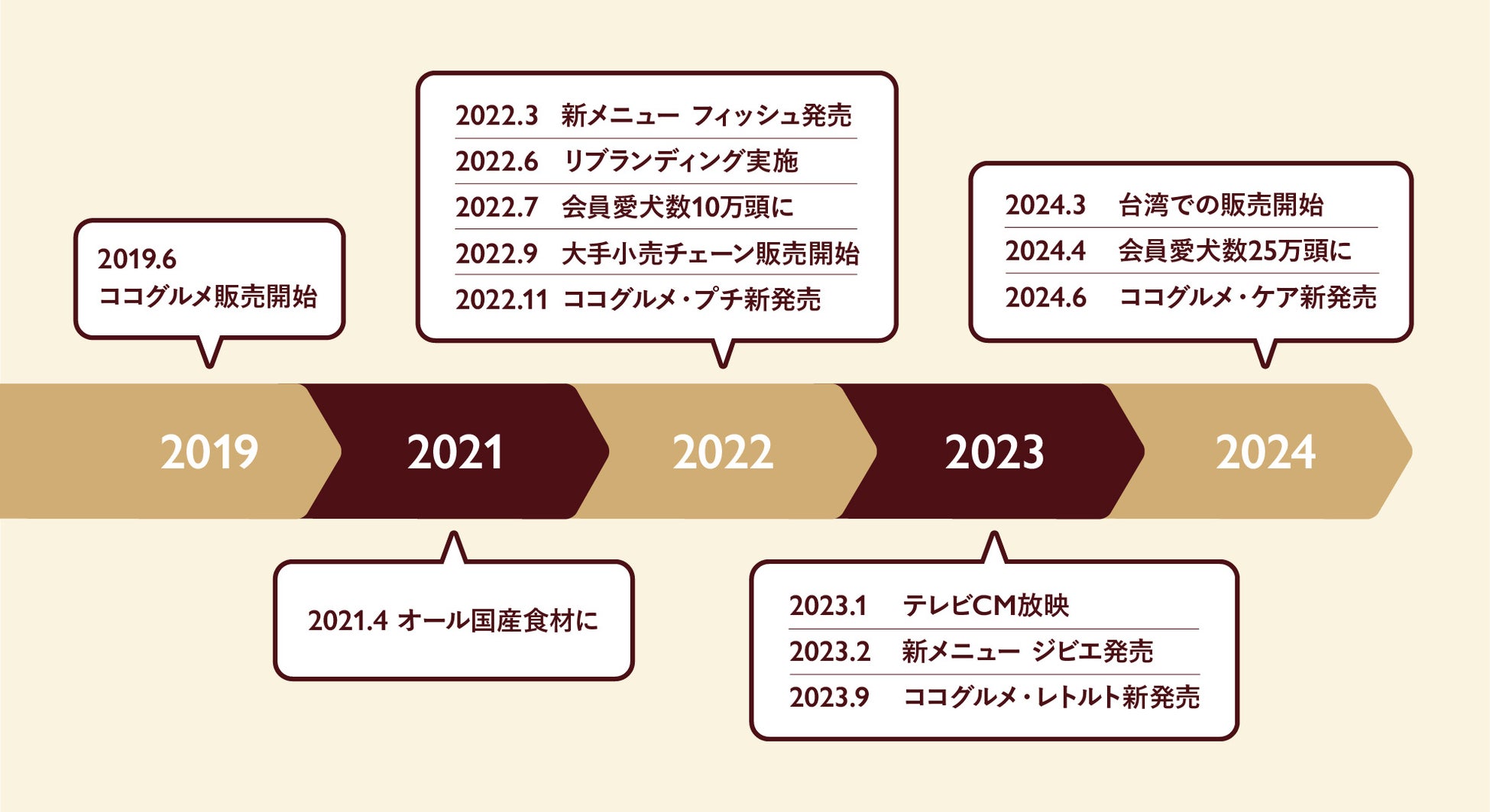フレッシュペットフードという新しい食事体験を日本の愛犬家、ワンちゃんたちに受け入れていただき満足していただけるよう、日々お客さまからいただくご意見、ご感想、お悩みの声一つ一つに耳を傾け、食材の選定から調理方法の見直しなど細部までこだわり開発してまいりました。お客さまとワンちゃんに商品開発のモニターとしてご参加いただく「ココグルメごはん開発部」というプロジェクトを発足し、これまで8回の商品リニューアルを実施するなど、ココグルメの5年間は常にお客さまとその愛犬のワンちゃんとともに歩んできました。