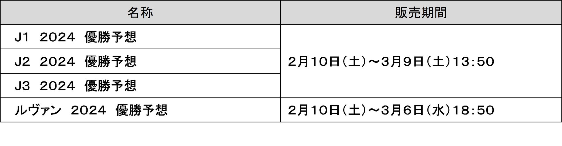 ・2月23日(金)から12月8日(日)にかけて開催されるJ1、J2、J3の全試合※4、3月6日(水)から開催されるルヴァンカップの全試合※4や天皇杯の試合※5の1試合予想くじを販売するほか、J1、J2、J3やルヴァンカップの優勝チームを予想する競技会予想くじも販売中です。