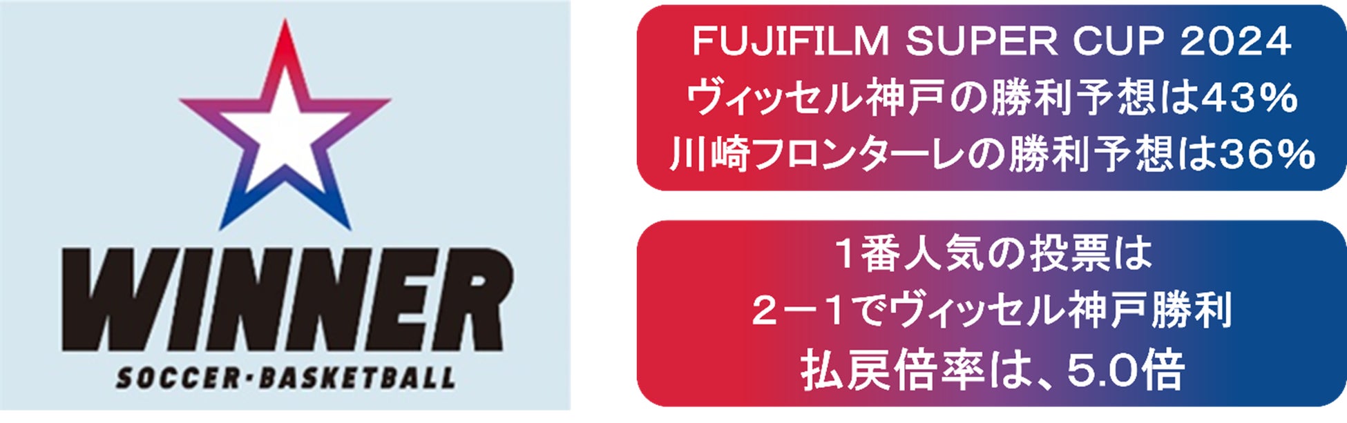 なお、「WINNERサッカー1試合予想(ヴィッセル神戸 vs 川崎フロンターレ)」は、2月17日(土)13時25分まで販売いたします*。国立競技場で開催されるFUJIFILM SUPER CUP 2024を「WINNER」と併せてぜひお楽しみください。