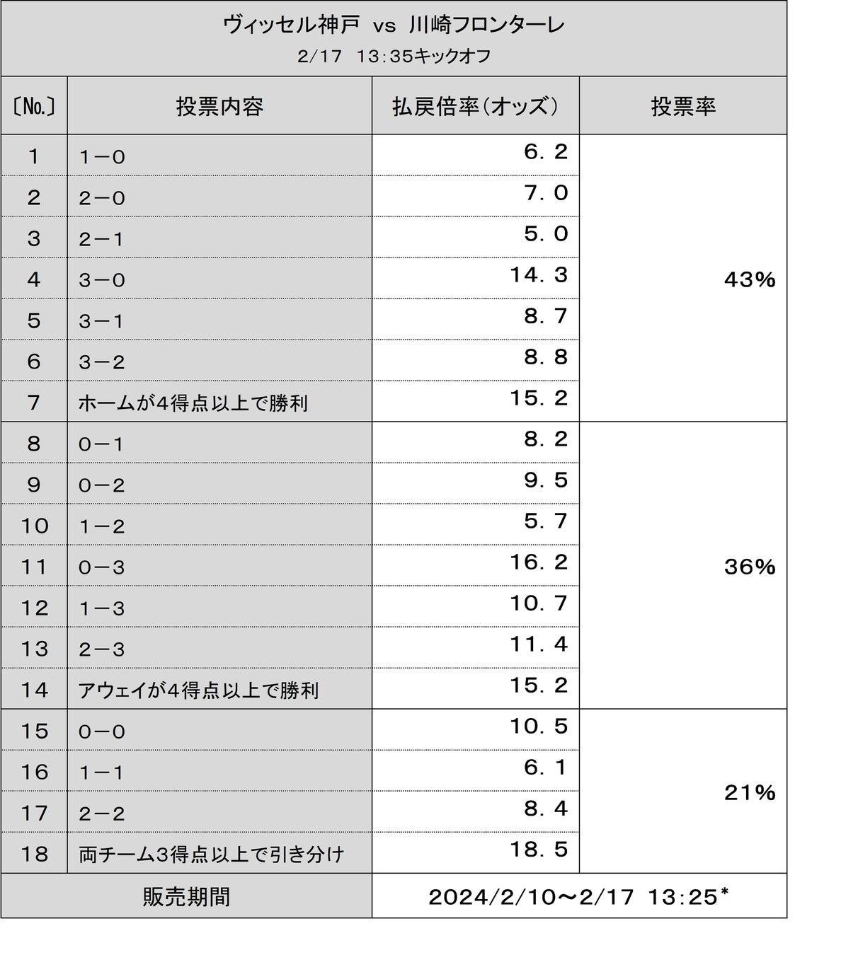 ※1 2月16日(金)10時時点の投票状況となります。払戻倍率(オッズ)は、投票状況により販売終了まで変動します。払戻倍率(オッズ)は、スポーツくじオフィシャルサイト(https://www.toto-dream.com/)で随時更新しています。