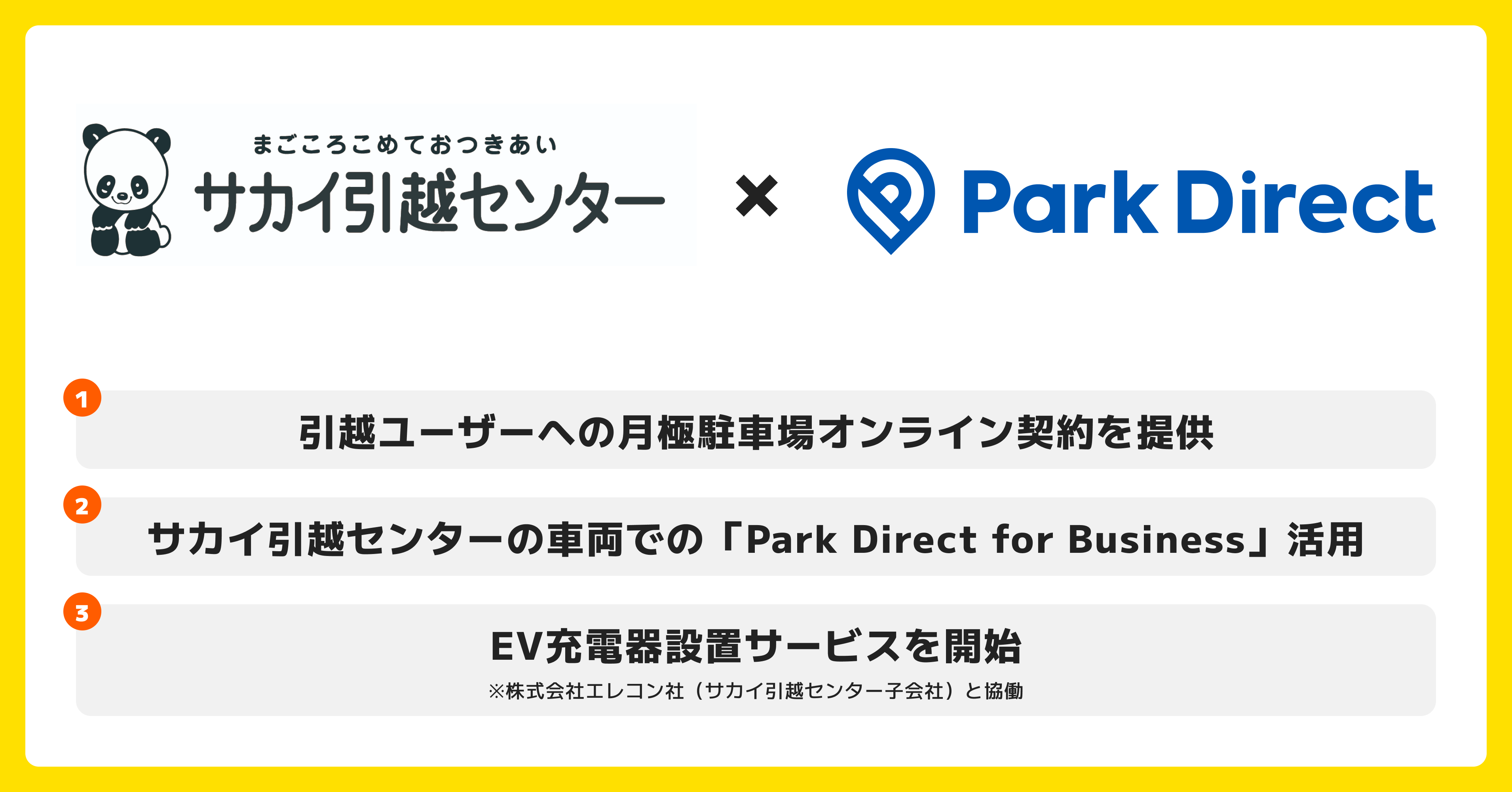 この度の包括的な資本業務提携を通じて、価値あるサービスをお客様に提供できることを心から嬉しく思います。この提携により、まずは引越をされるお客様と月極駐車場のオンライン契約サービス「Park Direct」をご利用のお客様を対象に、双方のサービスの連携を図ります。これによって、お客様の生活が一層便利になることを目指しています。さらに、「Park Direct for Business」を導入することでサカイ引越センター様の業務効率を大幅に向上させるほか、グループ会社の株式会社エレコン社と共に、EV充電インフラの整備を進め、持続可能なサービス拡充を目指してまいります。