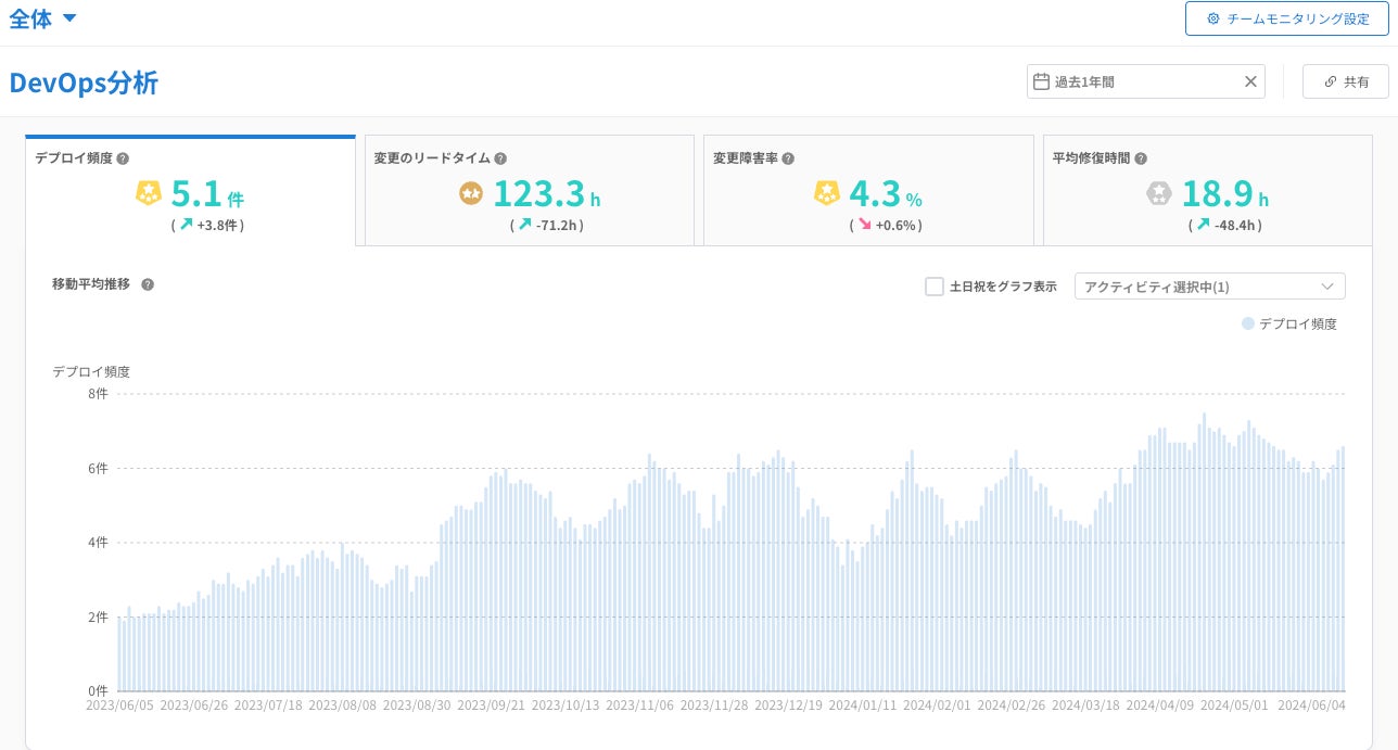 ・自分たちの目指す開発組織を定義すること、そのためにFour Keysの指標を可視化して現状を知ることを目的として「Findy Team+」を導入。
