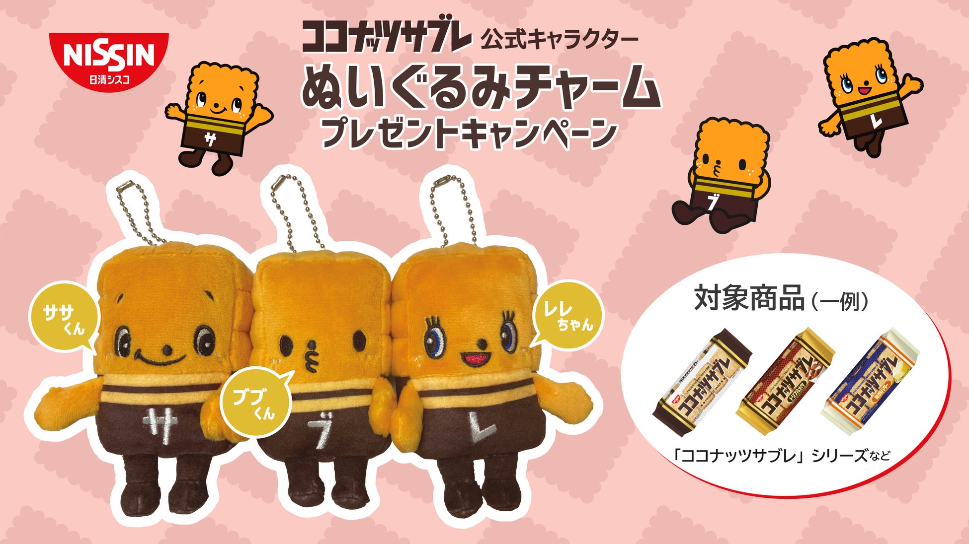 日清シスコ株式会社 (社長:浅井 雅司) は、「ココナッツサブレ」の公式キャラクター「ササくん」「ブブくん」「レレちゃん」のぬいぐるみチャーム3体セットが抽選で当たるキャンペーンを11月1日(火)より順次実施します。