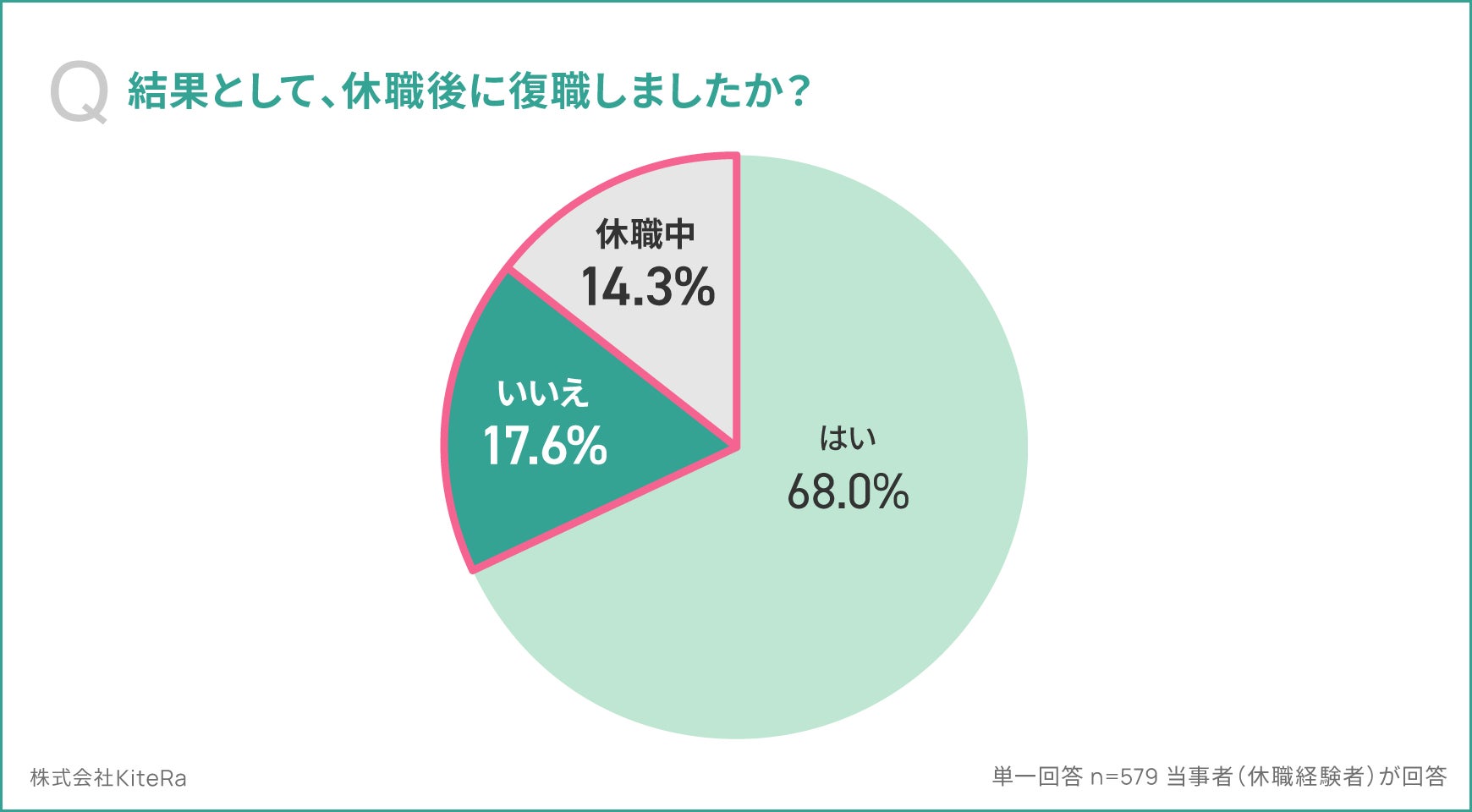 さらに、「結果として、休職後に復職しましたか(単一回答)」の質問に対し、「はい」が68.0%、「いいえ」が17.6%、「休職中」が14.3%でした。