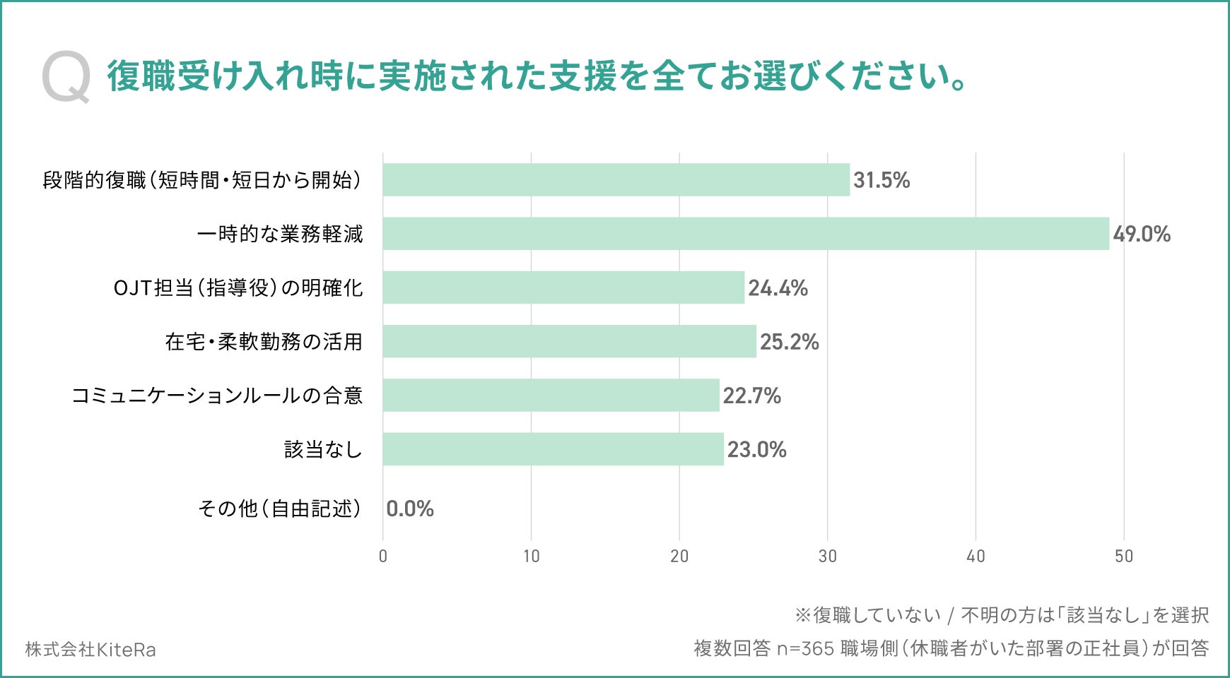 また、「復職受け入れ時に実施された支援を全てお選びください(複数回答)」の質問に対し、最も多かったのは「一時的な業務軽減」が49.0%、次いで「段階的復職(短時間・短日から開始)」が31.5%、「在宅・柔軟勤務の活用」が25.2%でした。