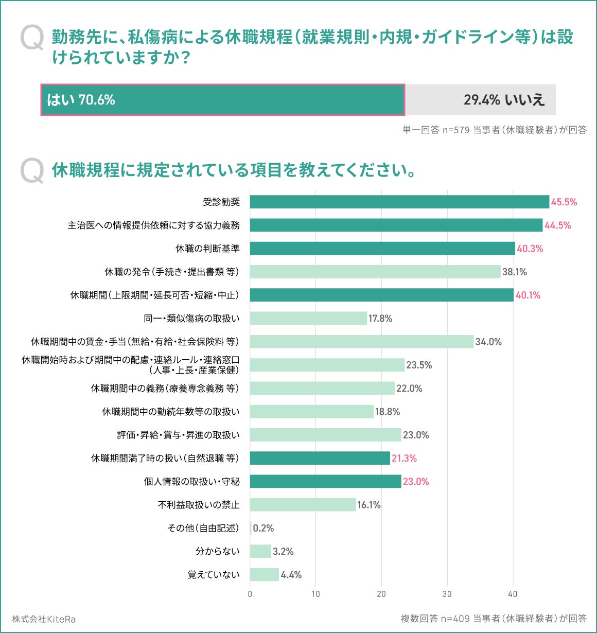 休職規程は7割で整備。主な規定項目は「受診勧奨」45.5%、「休職の判断基準」40.3% など