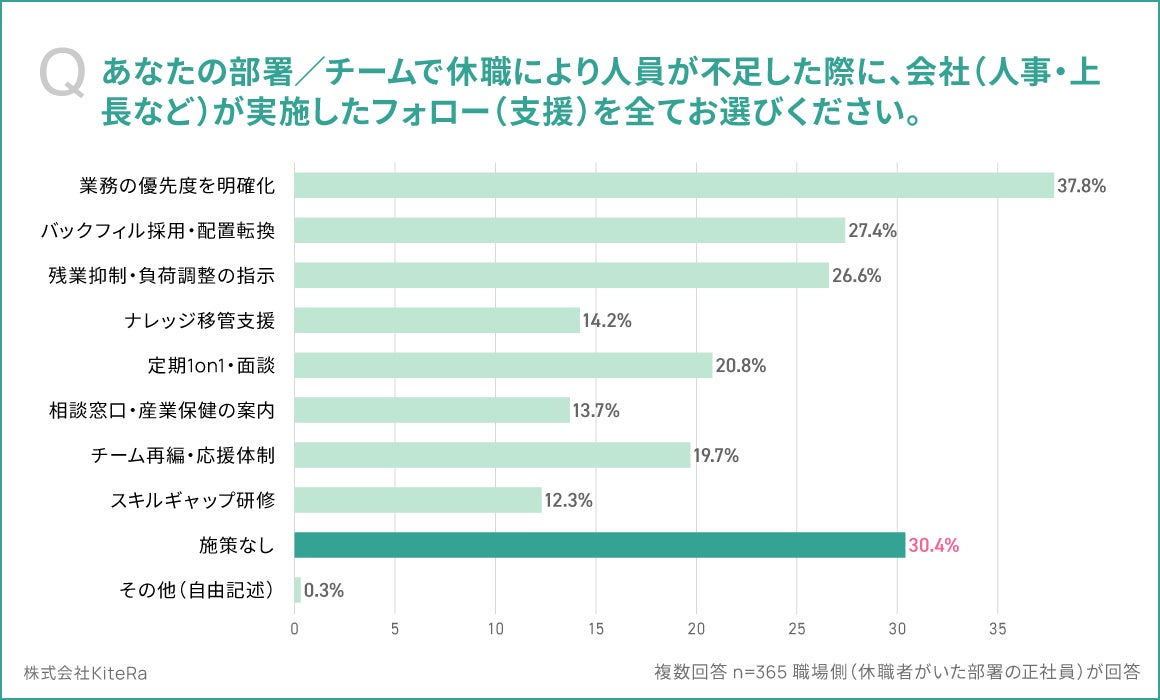 職場側では、休職発生後に「業務量が増えた(大幅に増えた/やや増えた)」が62.5%で、実際の対応は「既存メンバーで分担」64.9%が最多でした。会社のフォロー(支援)は「業務の優先度明確化」37.8%が最多である一方で「施策なし」が30.4%も存在し、既存メンバーへの分担に寄りがちな傾向や、フォロー施策の設計・実行にばらつきがうかがえます。