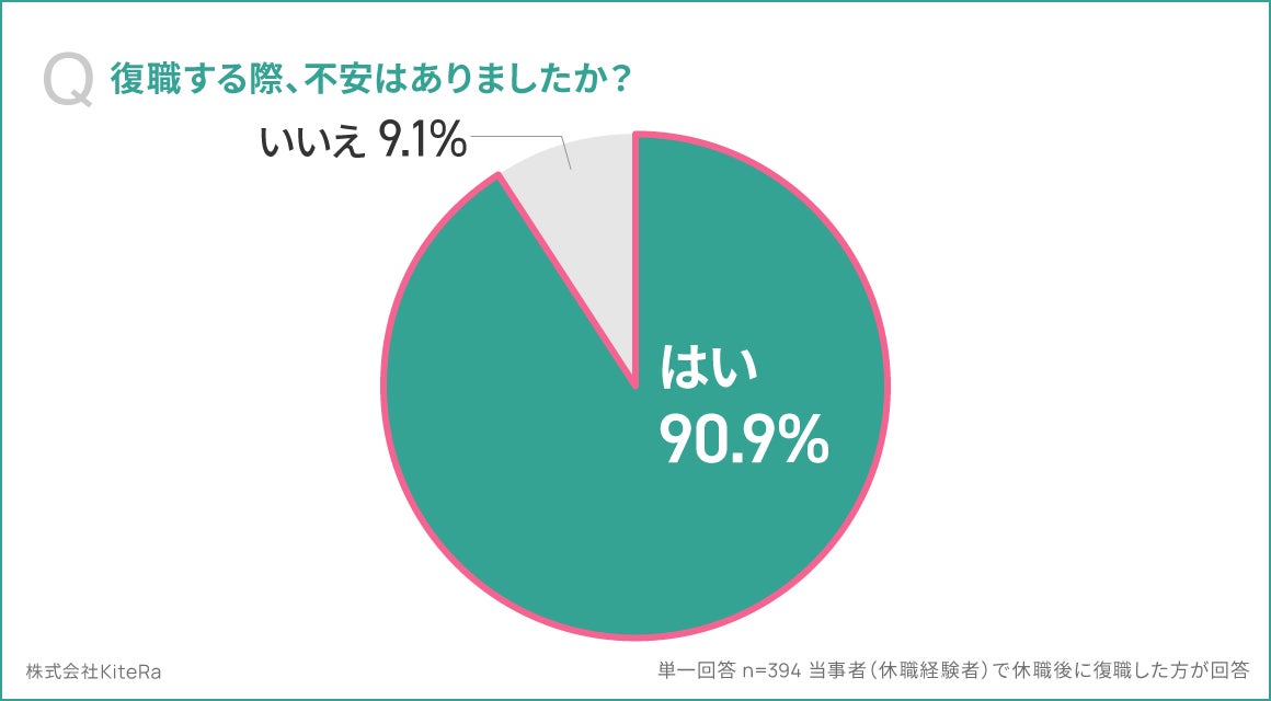 なお、「結果として、休職後に復職した方」に、「復職する際、不安はありましたか(単一回答)」と質問したところ、「はい」が90.9%、「いいえ」が9.1%という結果となりました。