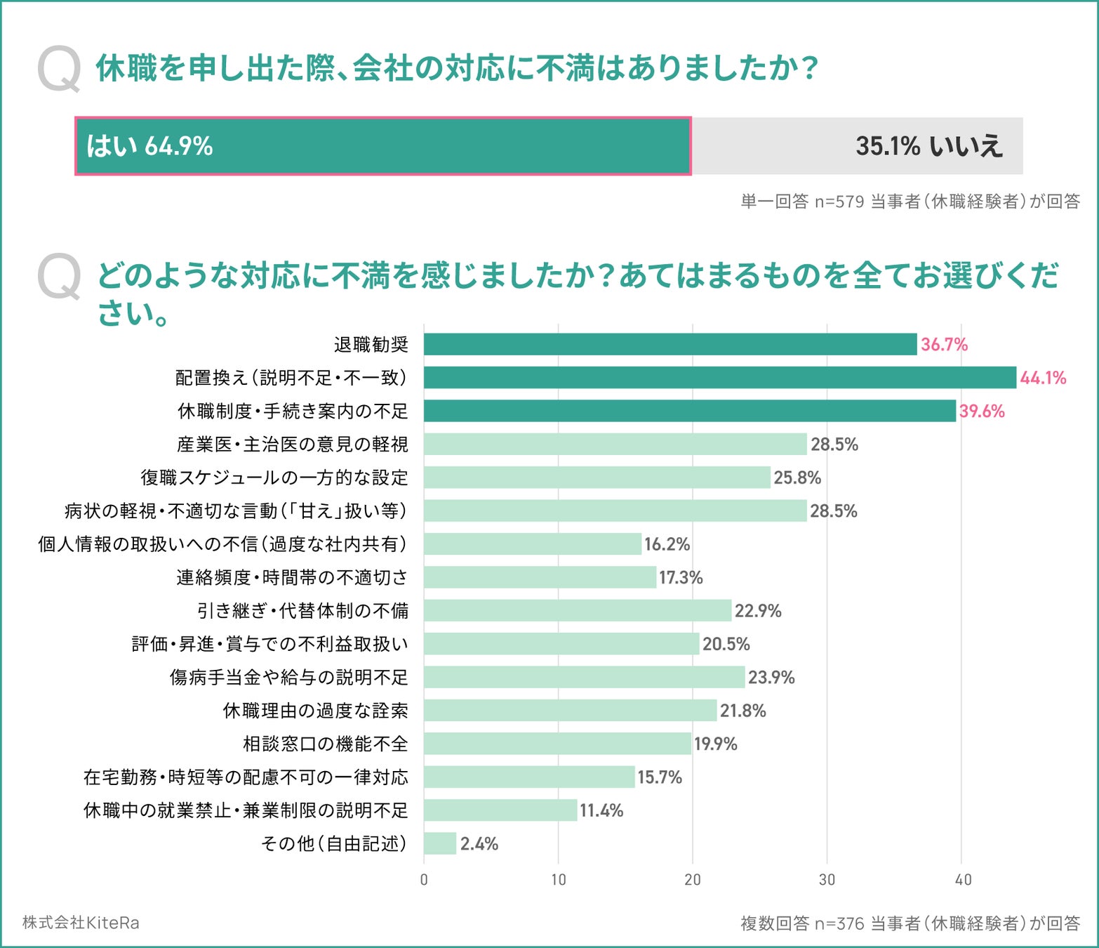 6割超が、休職申出時の会社対応に不満。不満の内訳上位は「配置換えの説明不足」44.1%、「休職制度・手続き案内の不足」39.6%、「退職勧奨」36.7%