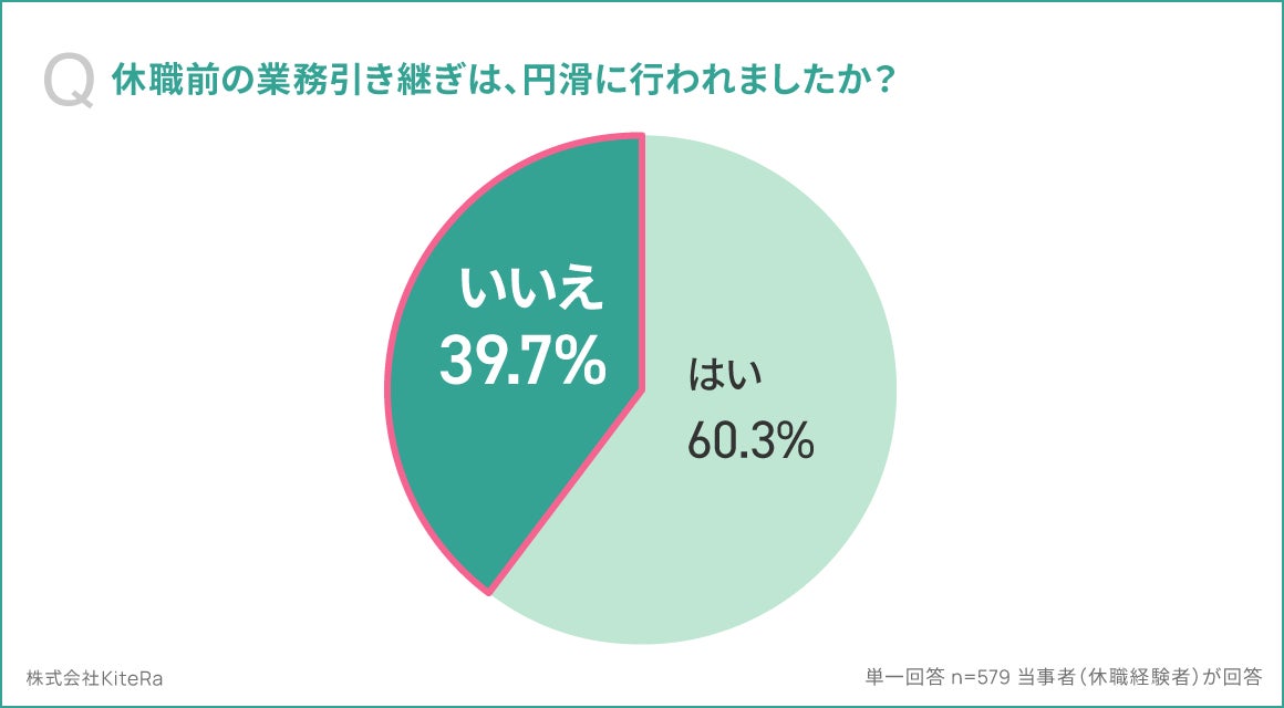 当事者(休職経験者)に、「休職前の業務引き継ぎは、円滑に行われましたか(単一回答)」と質問したところ、「はい」が60.3%、「いいえ」が39.7%でした。