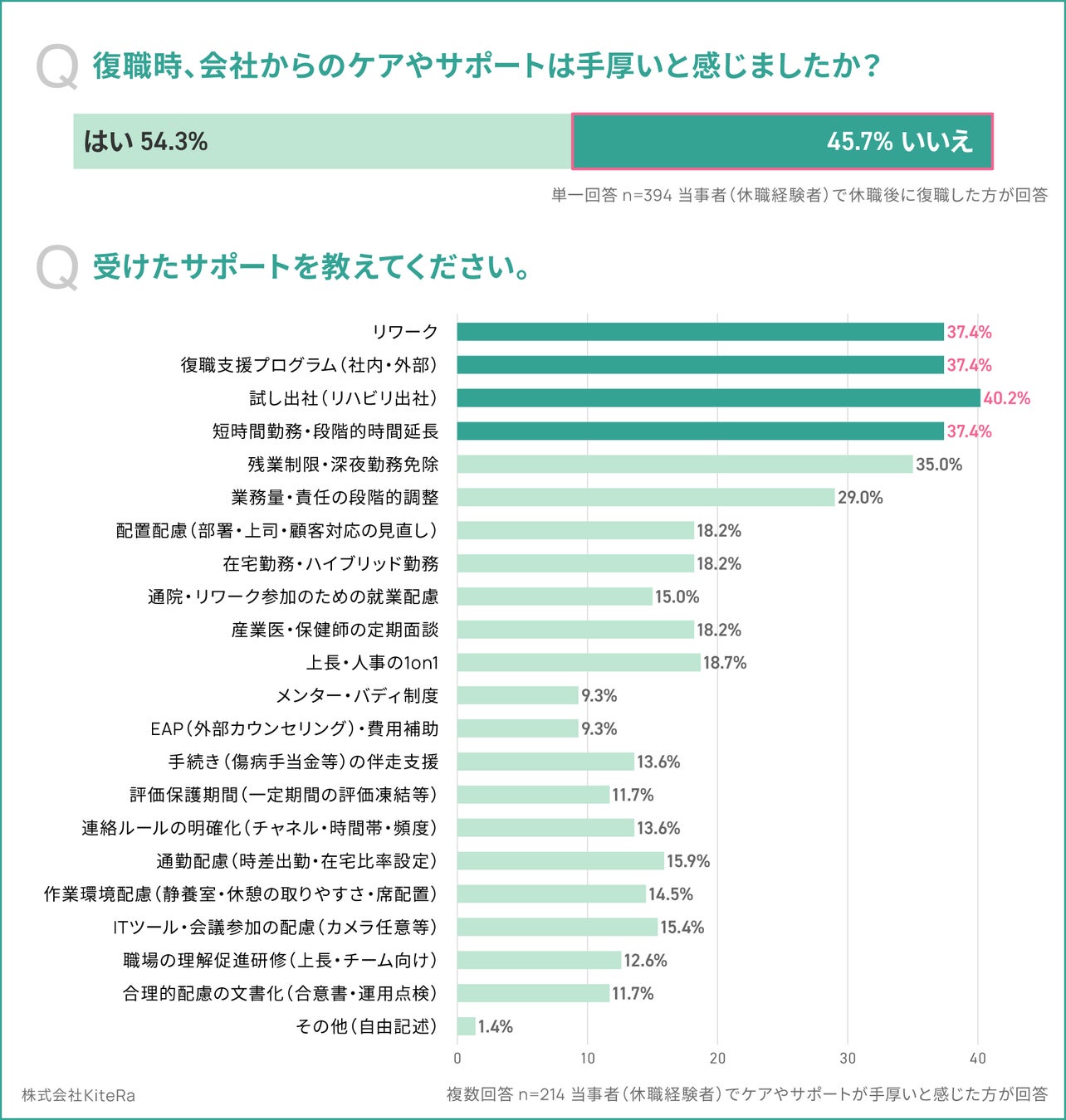 復職時の会社のケアを「手厚い」と感じたのは54.3%。受けた支援の上位は「試し出社」40.2%、「短時間勤務・段階的時間延長」37.4%