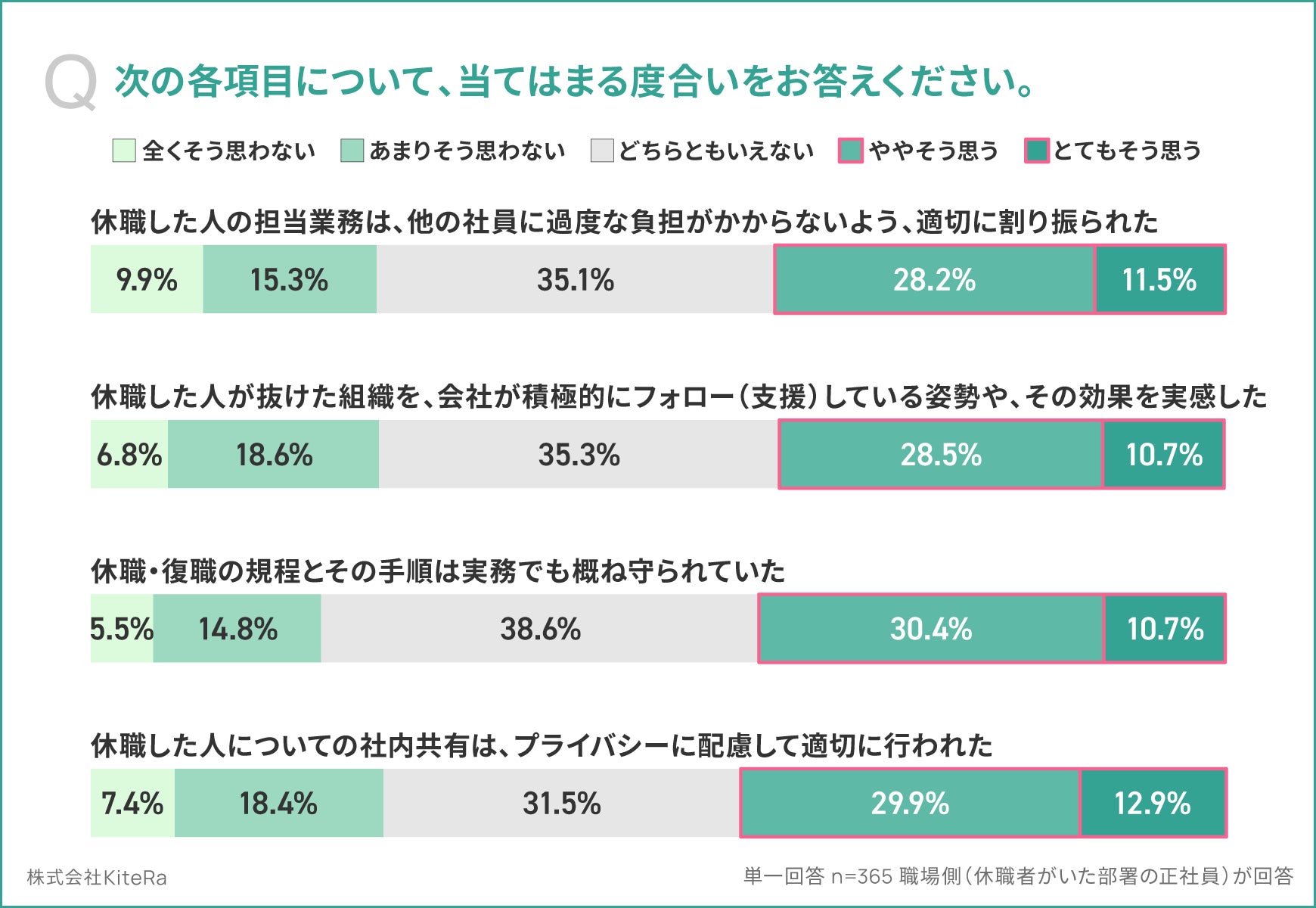 職場側(休職者がいた部署の正社員)に、休職者に関連する会社側の取り組みについての評価を質問したところ、「休職した人の担当業務は、他の社員に過度な負担がかからないよう、適切に割り振られたと思いますか」に対しての肯定(ややそう思う/とてもそう思う)は39.7%、「休職した人が抜けた組織を、会社が積極的にフォロー(支援)している姿勢や、その効果を実感しましたか」に対しての肯定(ややそう思う/とてもそう思う)は39.2% 、「休職・復職の規程とその手順は実務でも概ね守られていましたか」に対しての肯定(ややそう思う/とてもそう思う)は41.1%、「休職した人についての社内共有は、プライバシーに配慮して適切に行われたと思いますか」に対しての肯定(ややそう思う/とてもそう思う)は42.8%でした。