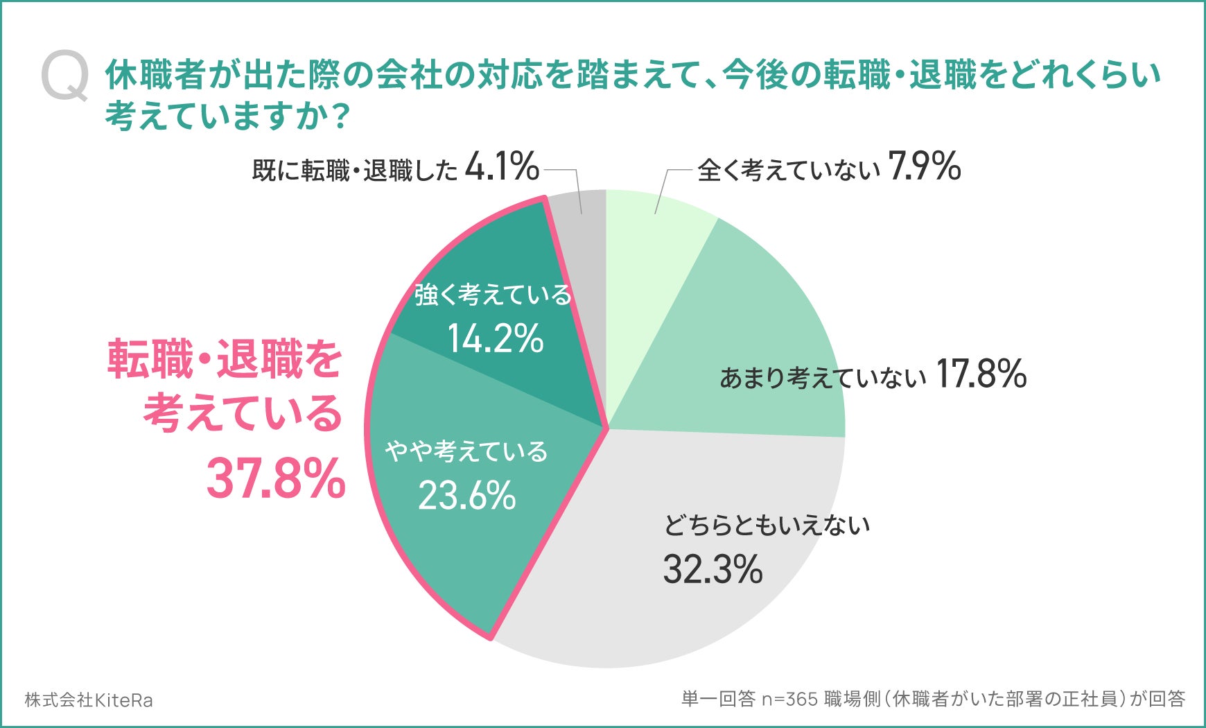 職場側(休職者がいた部署の正社員)に「休職者が出た際の会社の対応を踏まえて、今後の転職・退職をどれくらい考えていますか(単一回答)」と質問したところ、「転職・退職を考えている(やや考えている/強く考えている)」が37.8%、「既に転職・退職した」が4.1%、「考えていない(あまり考えていない/全く考えていない)」が25.7%、「どちらともいえない」が32.3%でした。