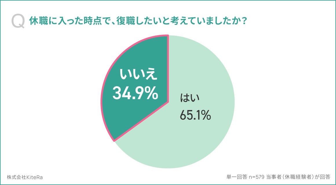当事者(休職経験者)に「休職に入った時点で、復職したいと考えていましたか(単一回答)」と質問したところ、「はい」が65.1%、「いいえ」が34.9%でした。