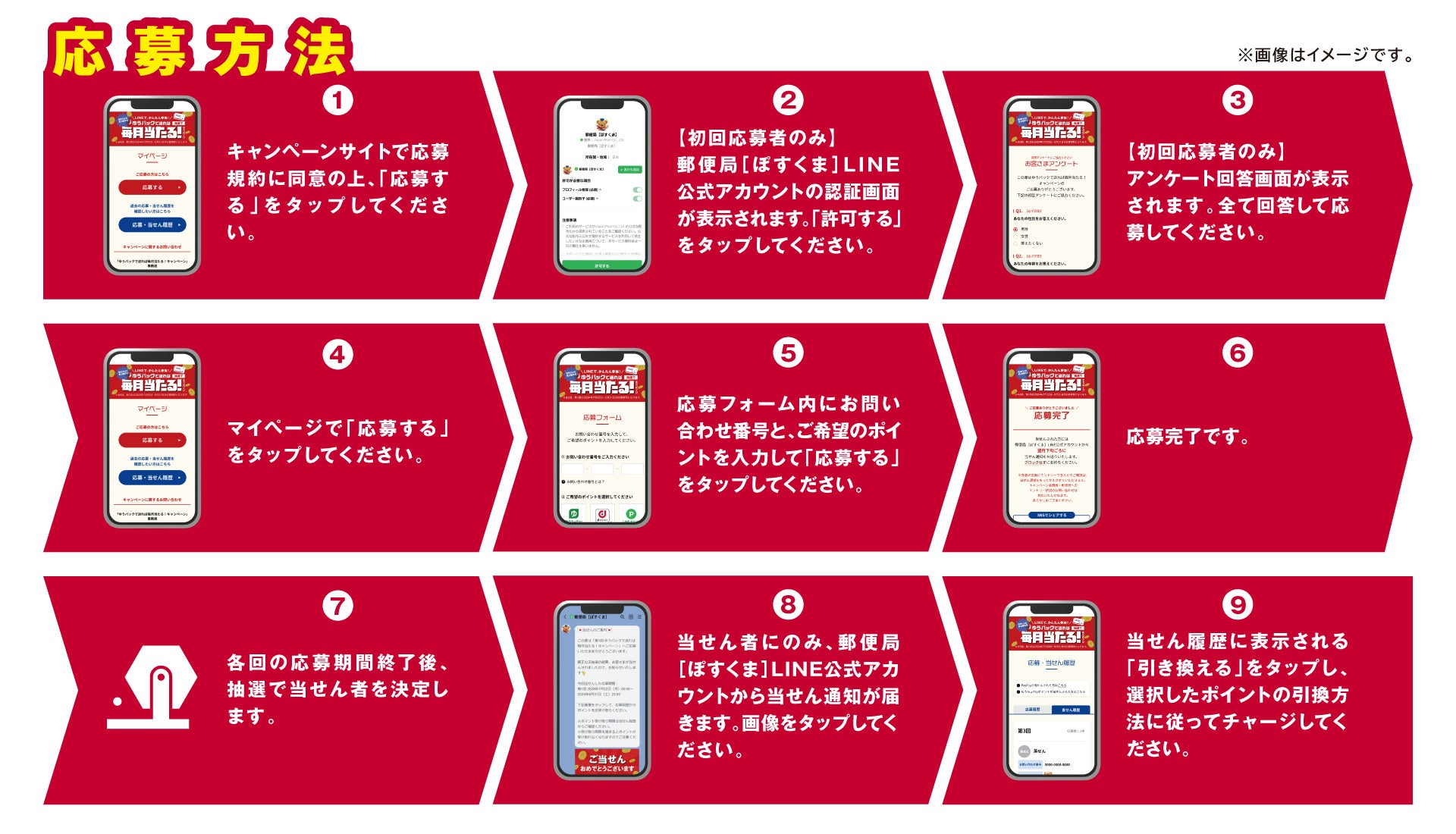 当選者あてに、郵便局[ぽすくま]LINE公式アカウントから、各応募対象期間の翌月末ごろに