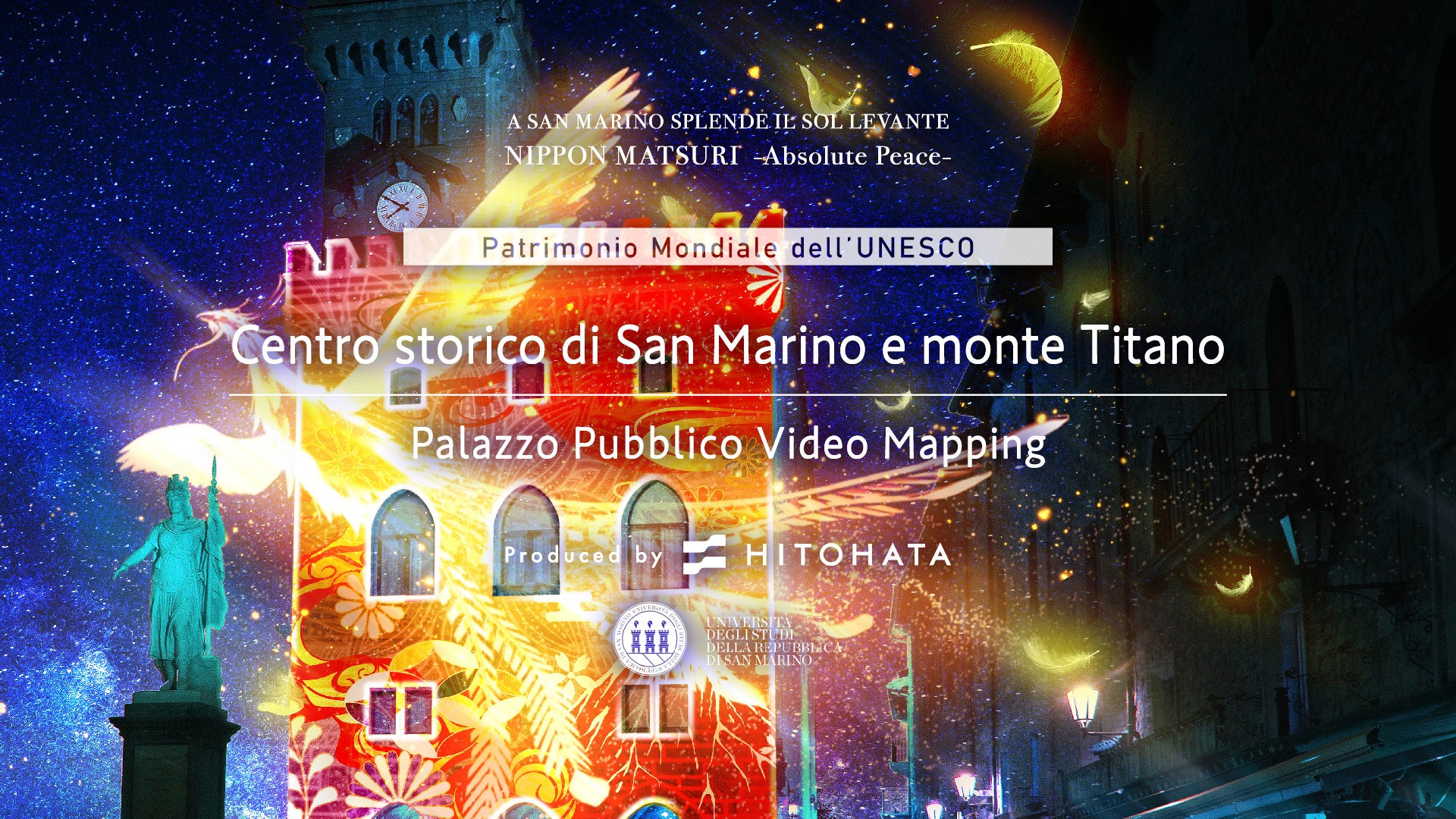 この催しは、ユネスコ世界遺産「サンマリノ歴史地区とティターノ山」の構成資産で、サンマリノ市の歴史的市街の代表的建造物「パラッツォ・パブリコ」に、日本の文化や伝統をモチーフにしたプロジェクションマッピング映像を投影します。