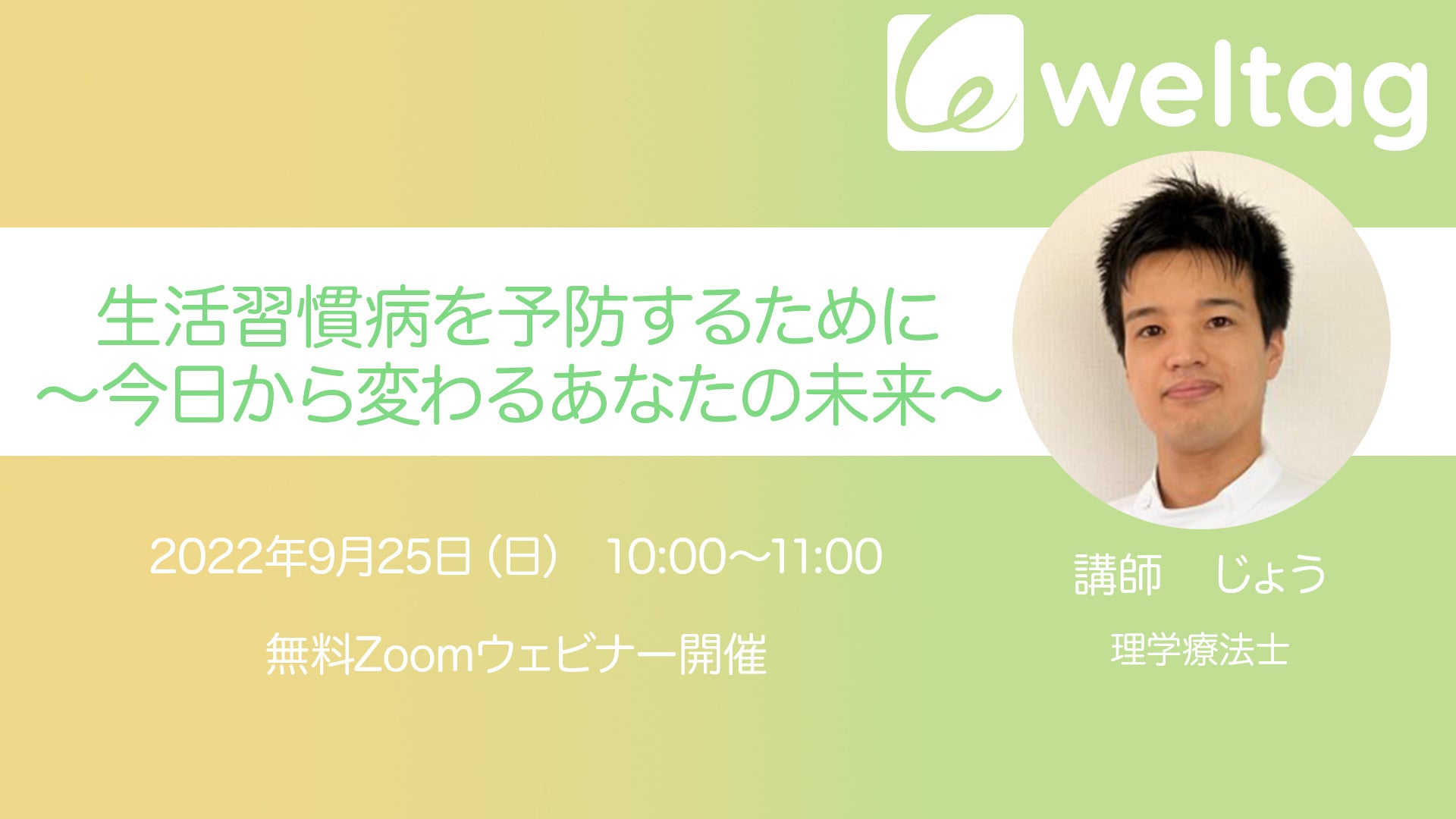「Well-being First!」を企業ミッションに掲げる、株式会社東急スポーツオアシス(本社:東京都渋谷区、代表取締役社長:山岸通庸、以下オアシス)は、オアシスのオンライントレーニングアプリweltag(ウェルタッグ)で活躍している理学療法士“じょう”トレーナーによるZoomウェビナー「生活習慣病を予防するために~今日から変わるあなたの未来~」を、2022年9月25日(日)に参加費無料で開催します。