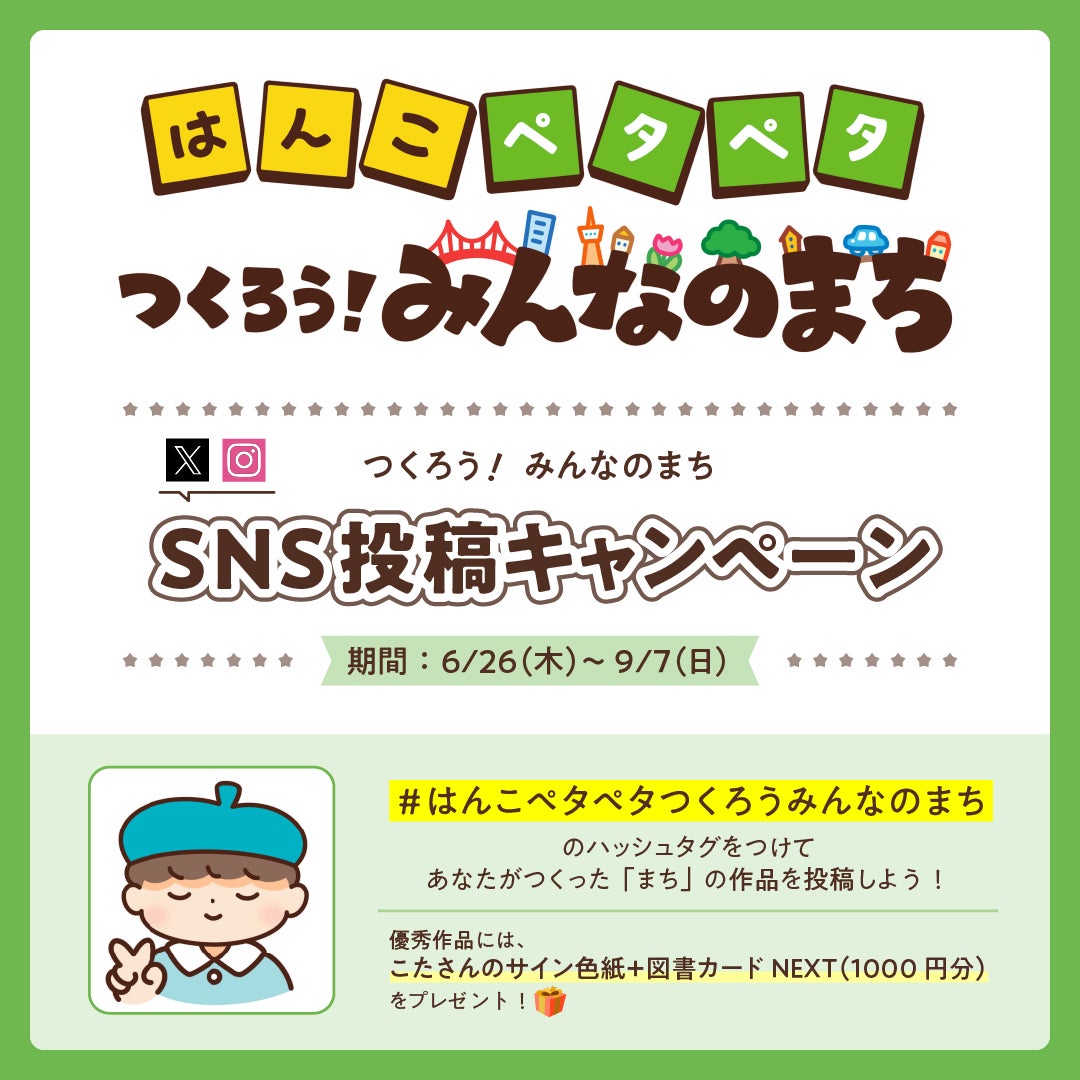 『はんこペタペタ つくろう!みんなのまち』を使った作品の画像を、キャンペーン指定のハッシュタグをつけてSNS(XまたはInstagram)に投稿してください。投稿いただいた作品の中から、こたさんが大賞(1名)・優秀賞(3名)を選出予定!応募者全員を対象とした抽選プレゼントも!
