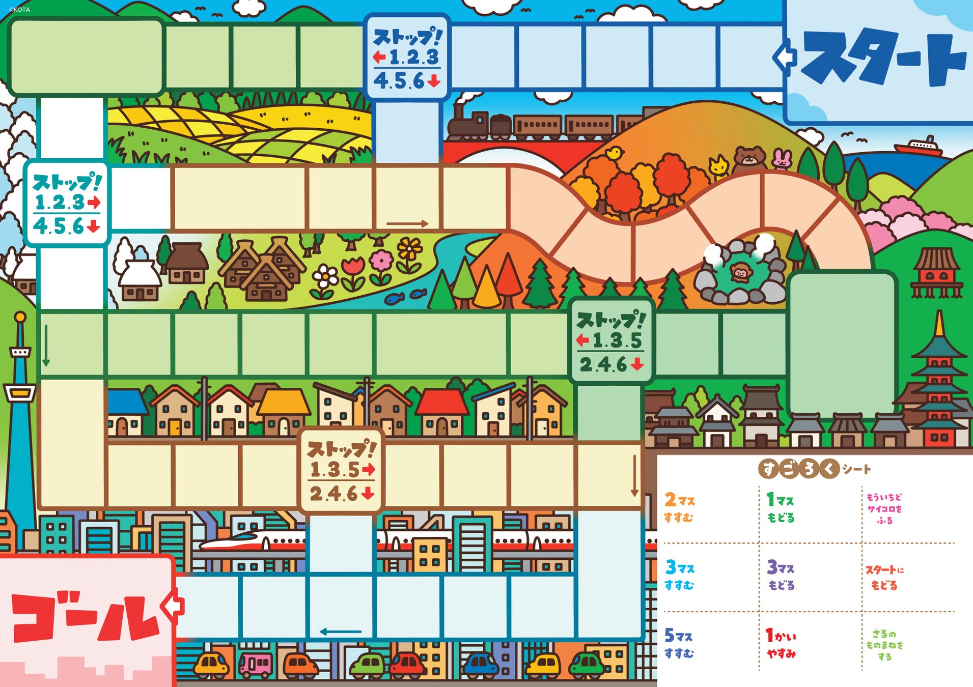 「すごろくシート」では、空欄のマス目に自分で好きなはんこを押し、「自分だけのすごろく」を作ることができます。表と裏で違う絵柄のすごろくをお楽しみください。